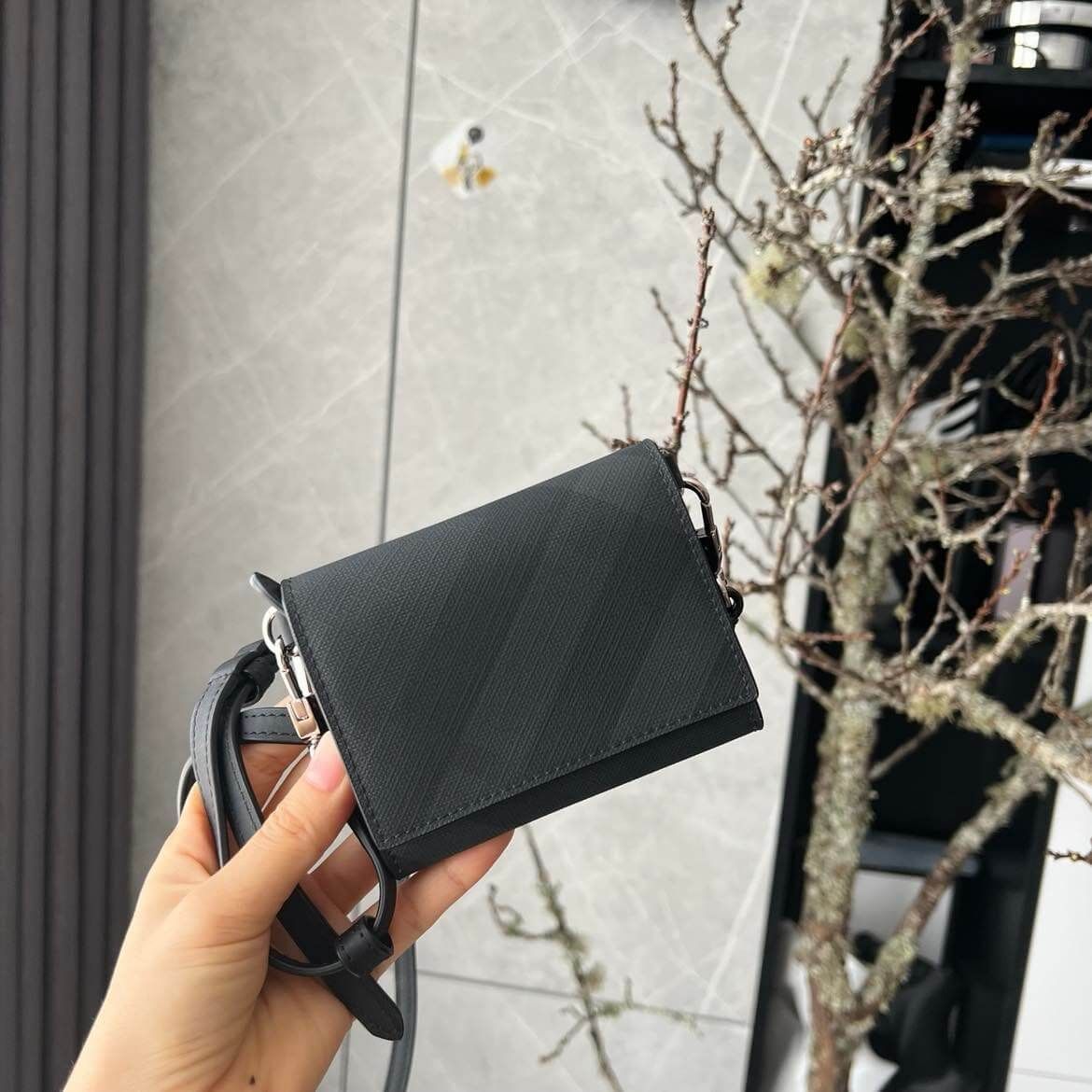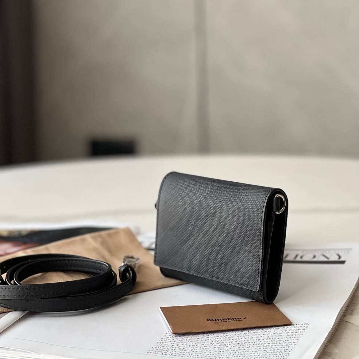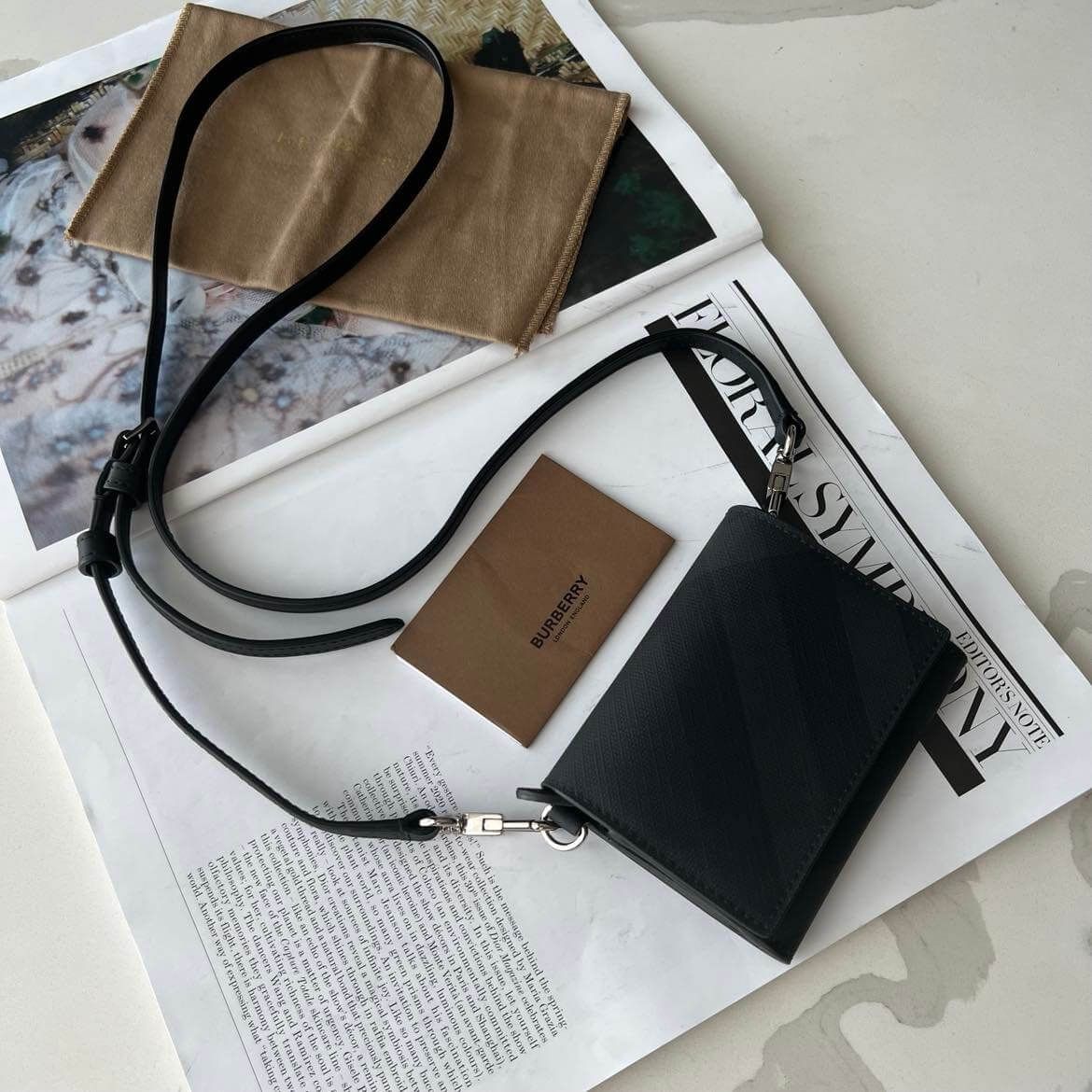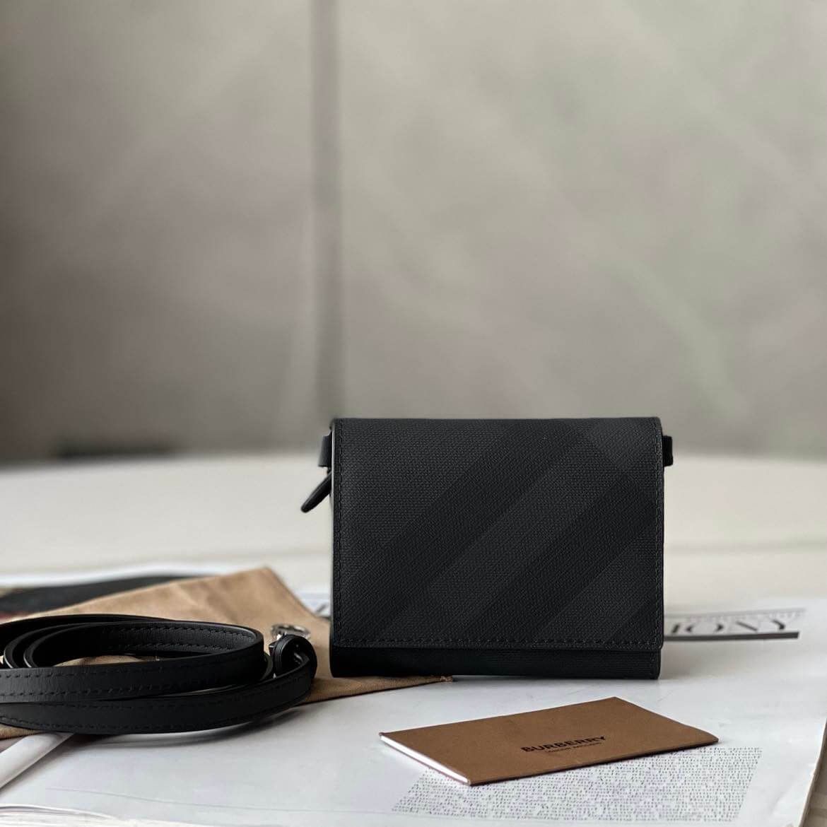 Hiếm lắm mới săn đc em card holder BBR mà lại kèm dây da đeo chéo check màu charcoal siêu đẹp như vậy ạ – unisex nam nữ đều okela luôn.