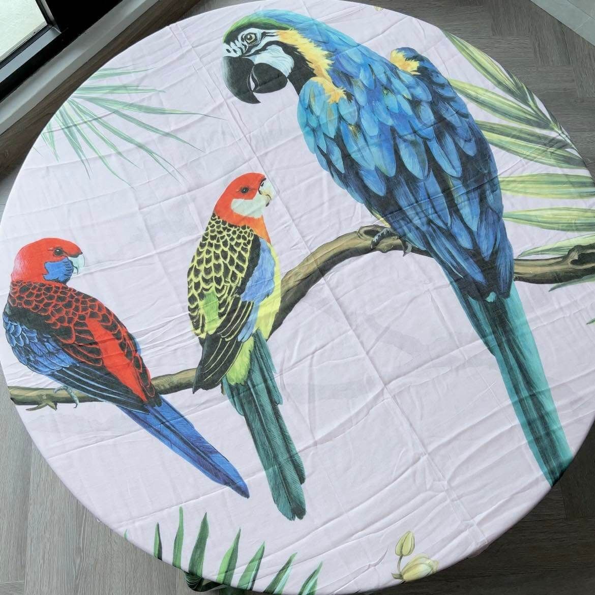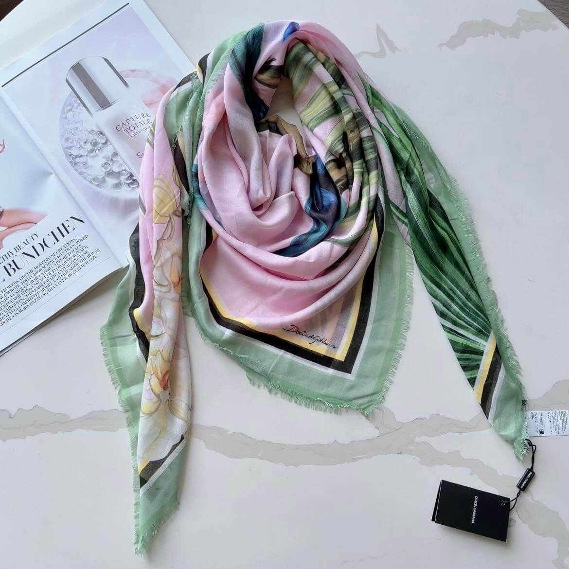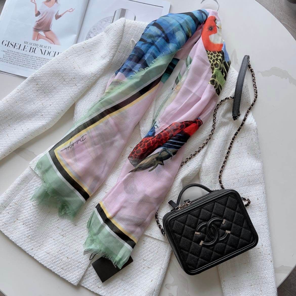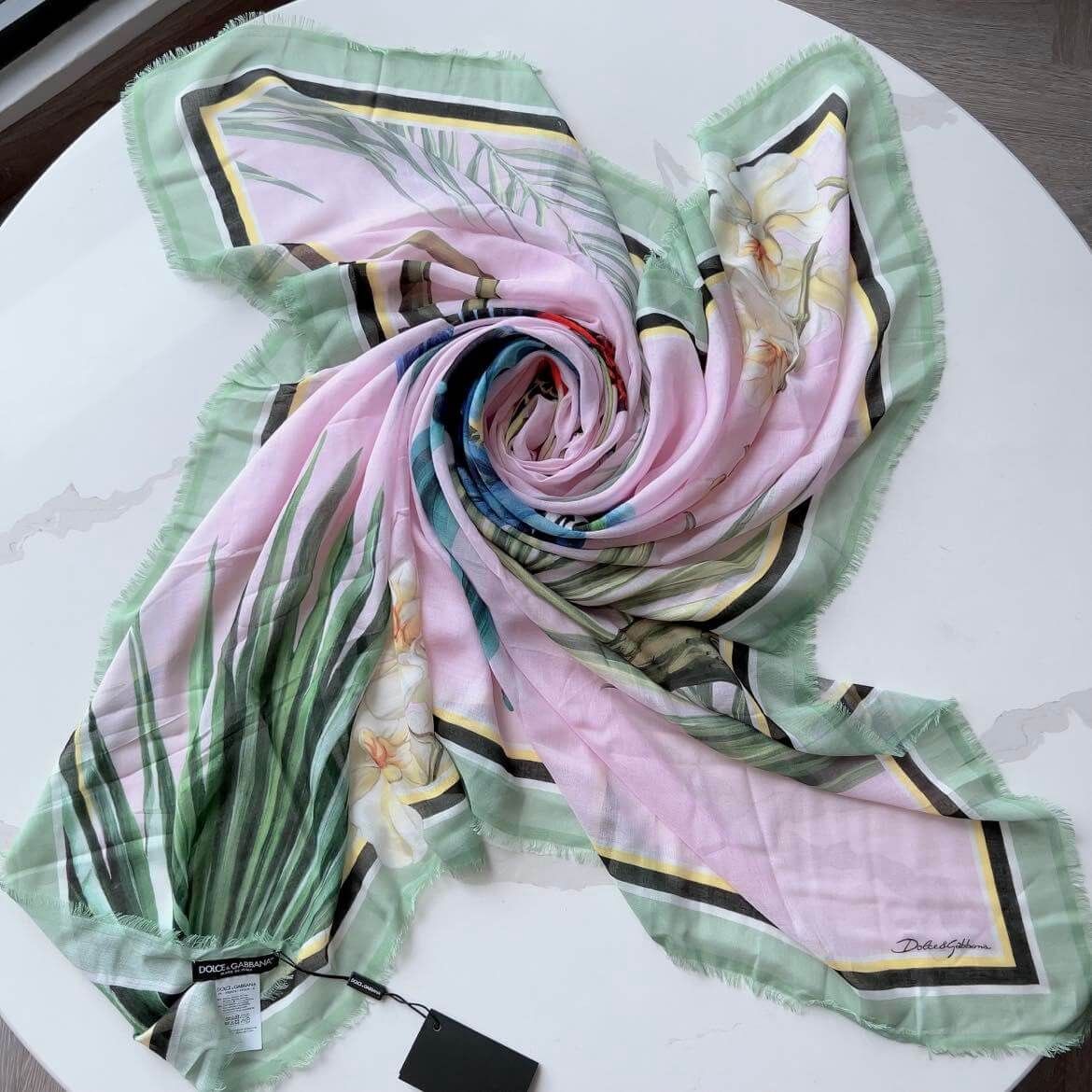 Đẹp quá đi thôi ạ, em về duy nhất 1c khăn DG họa tiết những chú vẹt siêu sang – với viền màu xanh mint nha