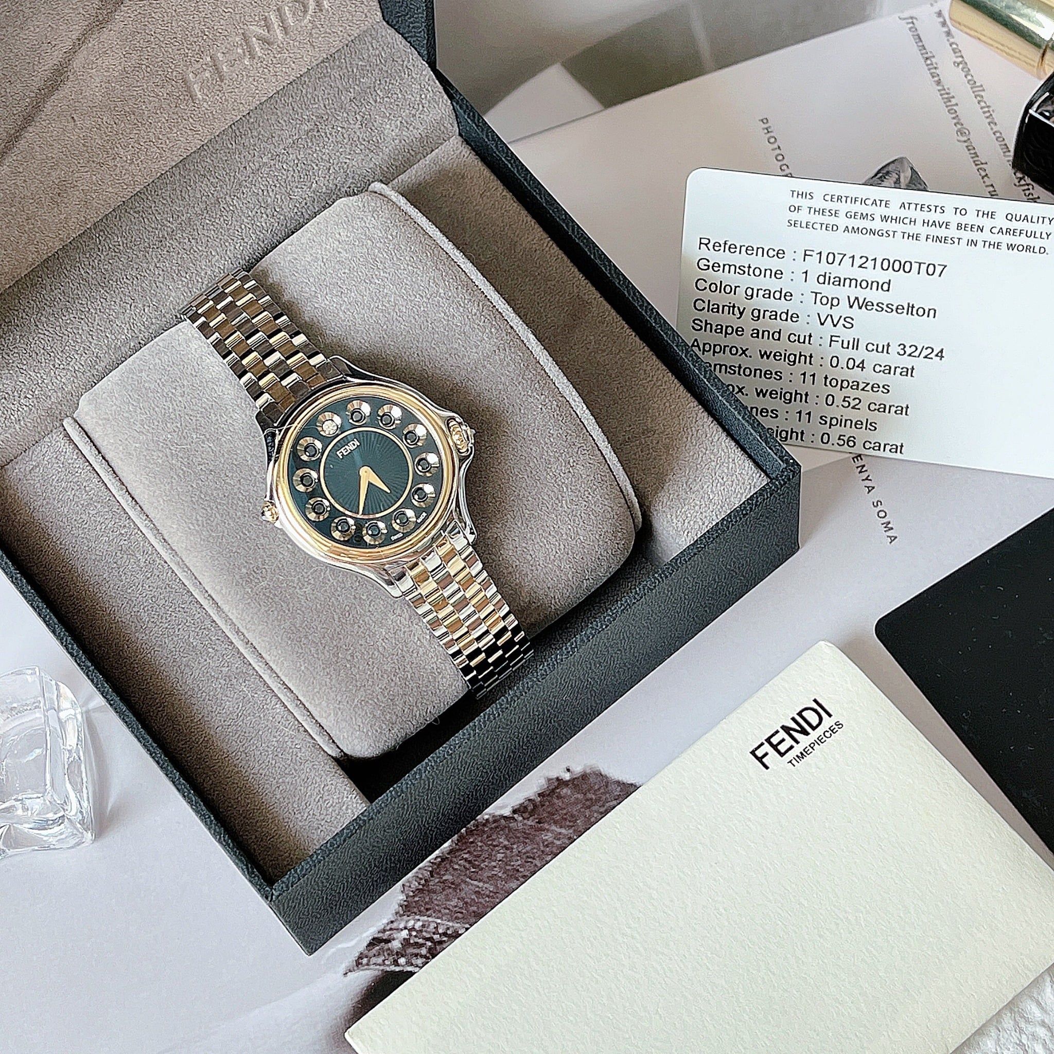 Mẫu FENDI Crazy Carats thuộc top 10 thương hiệu quyền lực nhất thế giới! Với chức năng chuyển màu các viên đá quý – sáng tạo độc quyền từ FENDl: Chỉ cần 1 động tác xoay núm, các nàng có thể sở hữu 3 mặt đồng hồ: số, đá đen và đá trắng Swiss made Size 33mm vừa vặn Kính: Sapphire nguyên khối chống lóa New, Fullbox, sẵn ship!