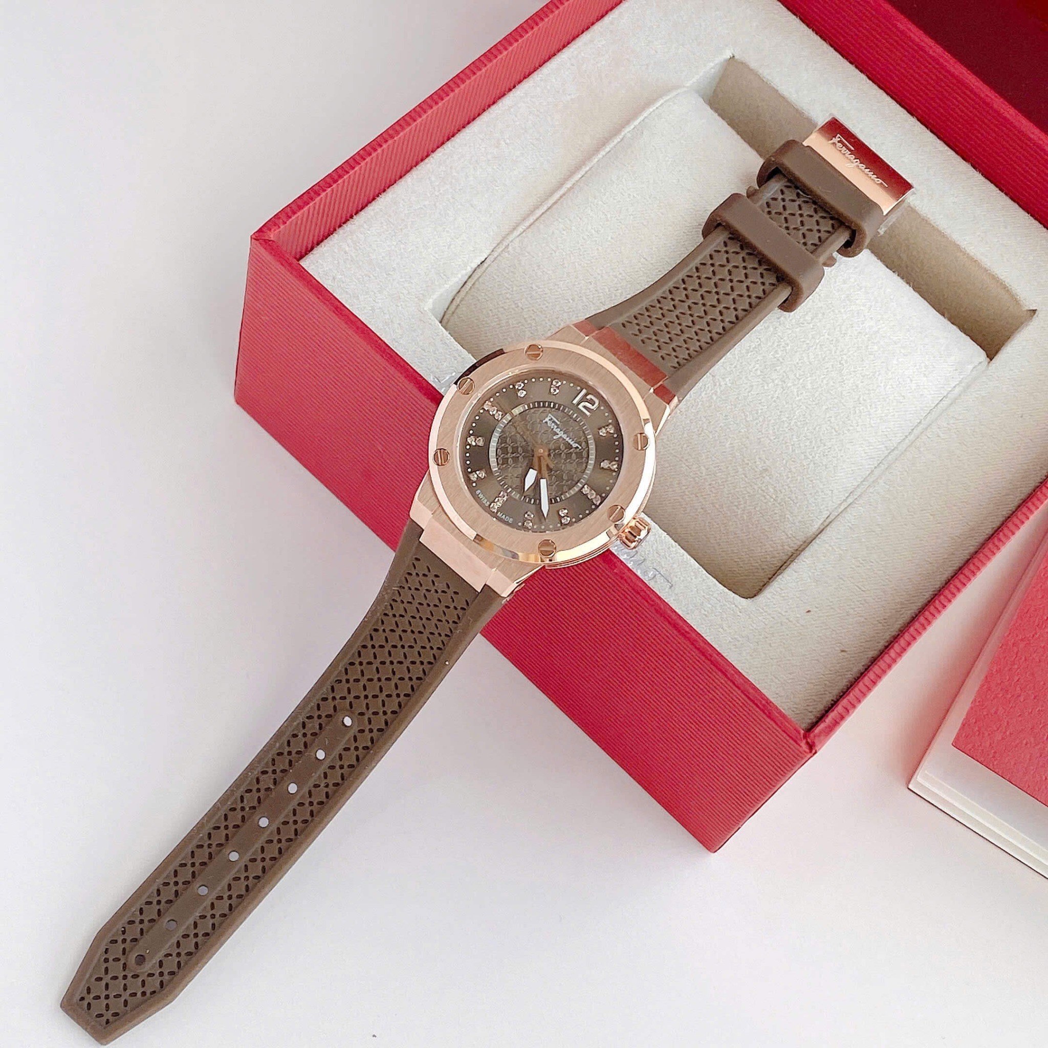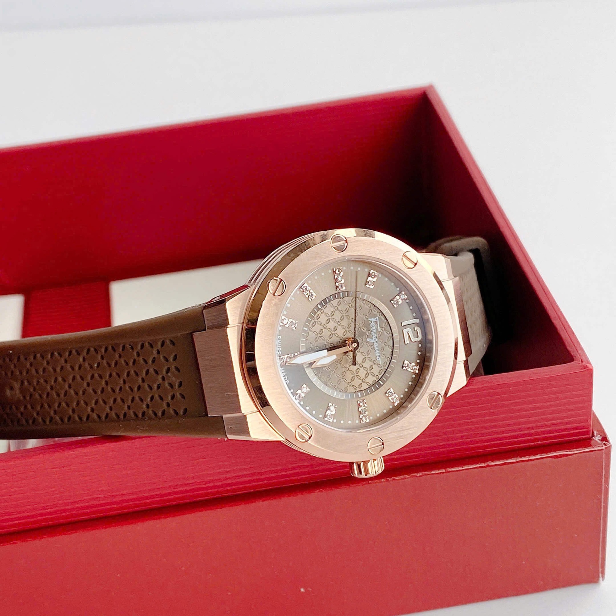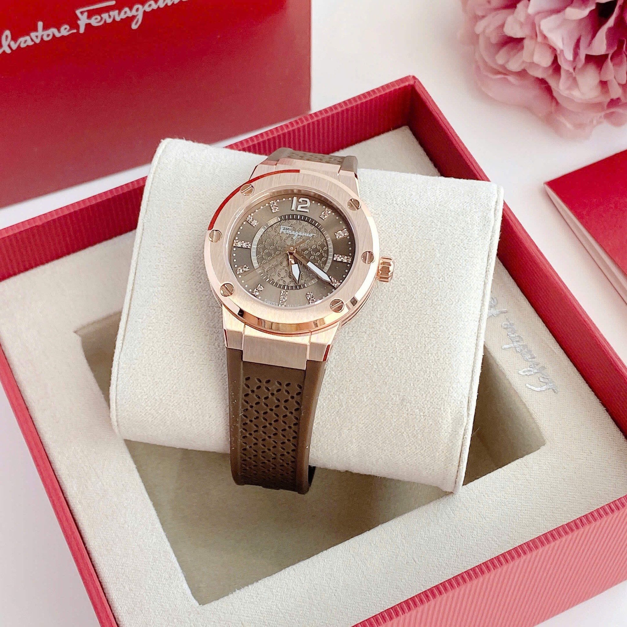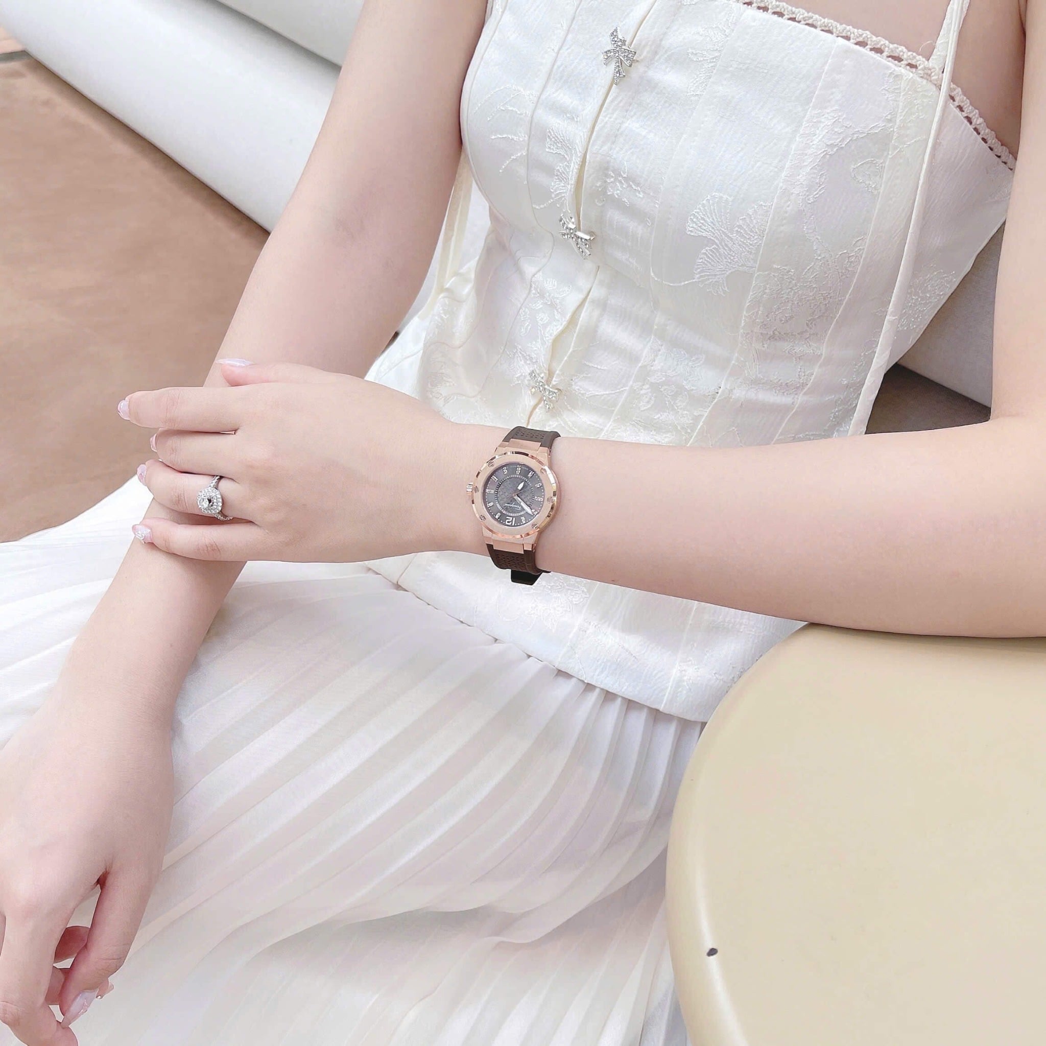 Dial nâu trùng màu dây, viền rose gold sang chảnh, đính diamond tại vị trí các nút giờ