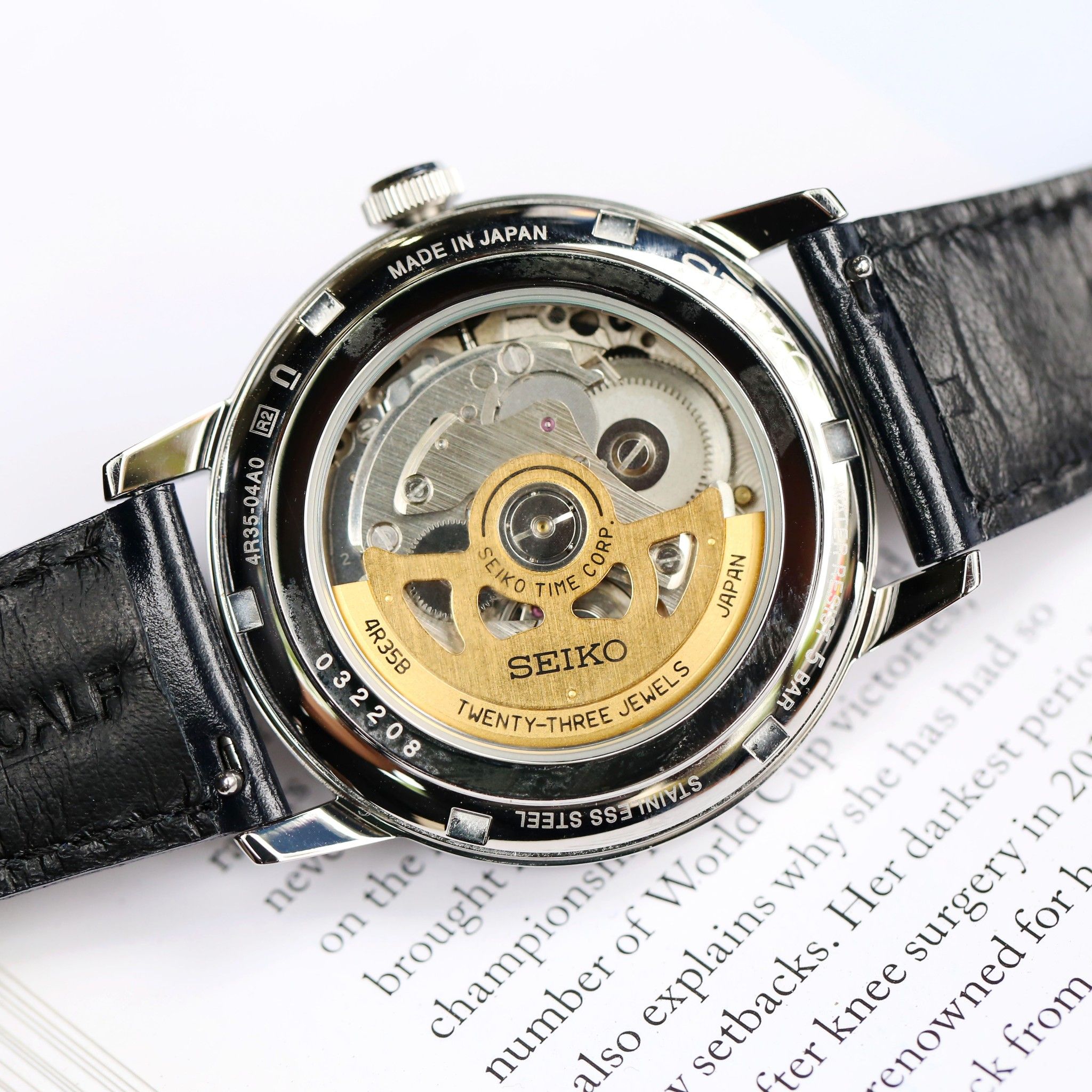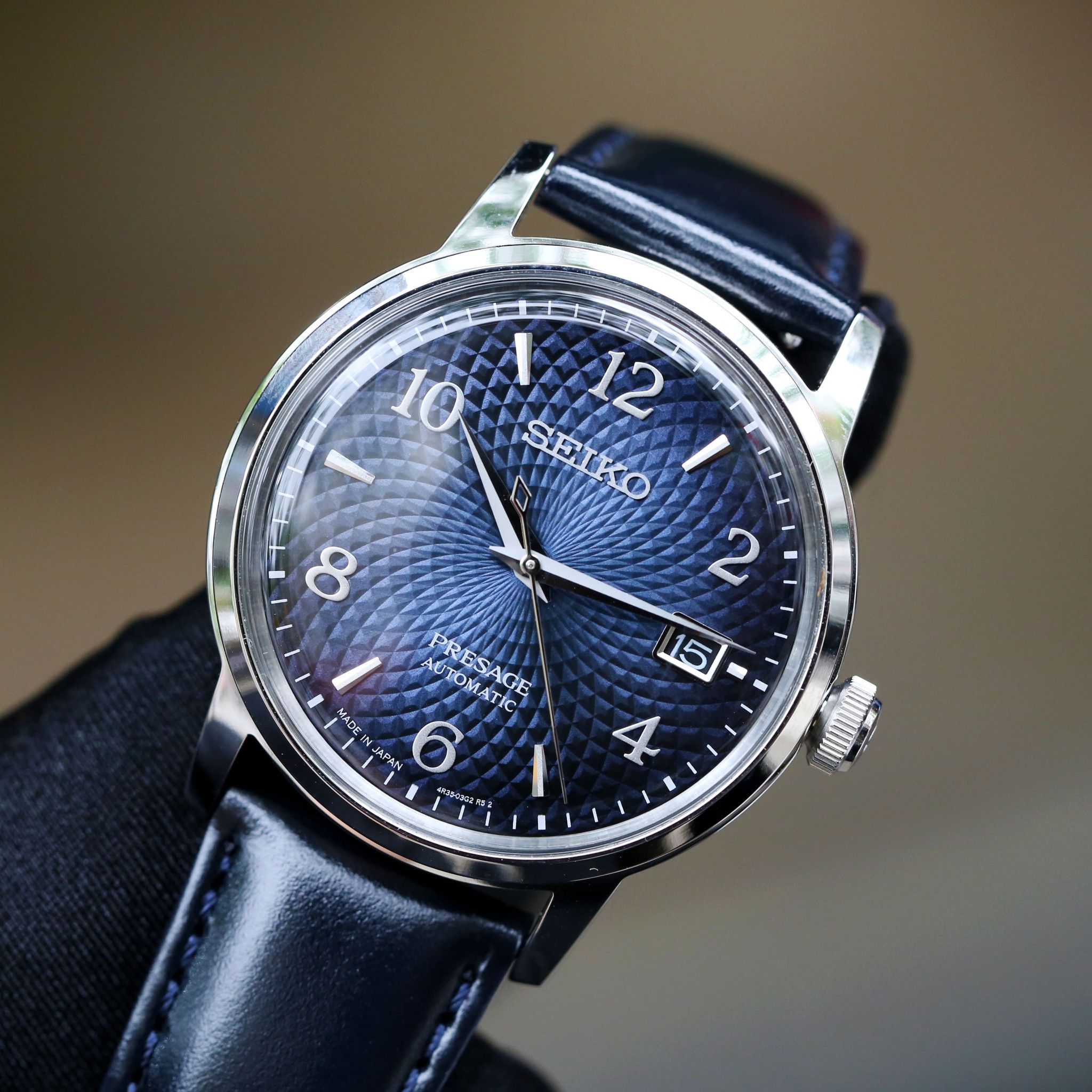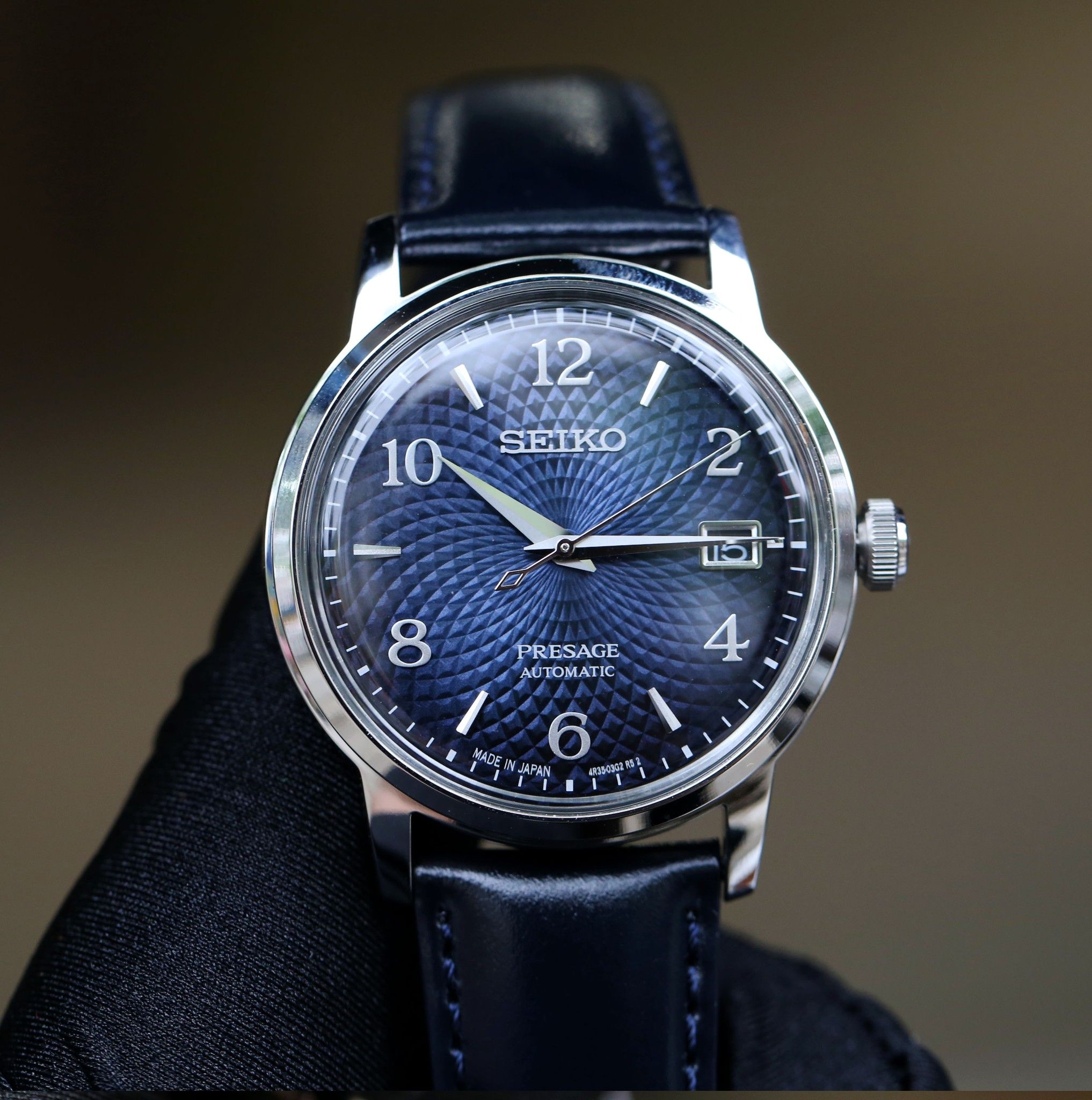 Được lấy cảm hứng từ ly cocktail Old Clock, mang màu xanh đậm đặc trưng. Nền mặt số được tạo nên từ những đường vân 3 chiều cực kỳ bắt mắt, mỗi góc nhìn lại cho một vẻ đẹp khác nhau. Về chức năng, SRPE43J1 cũng được trang bị cỗ máy cơ tự động 4R35, bao gồm các tính năng tương tự như SRPE41J1. Nhưng để tạo ra một tổng thể hài hoà về màu sắc, Seiko đã trang bị cho phiên bản này dây da xanh đen được làm từ da bê cao cấp, bền bỉ. Bạn cũng có thể quan sát cỗ máy tinh vi của chiếc đồng hồ này ở phía sau nắp lưng, thật tuyệt vời phải không?