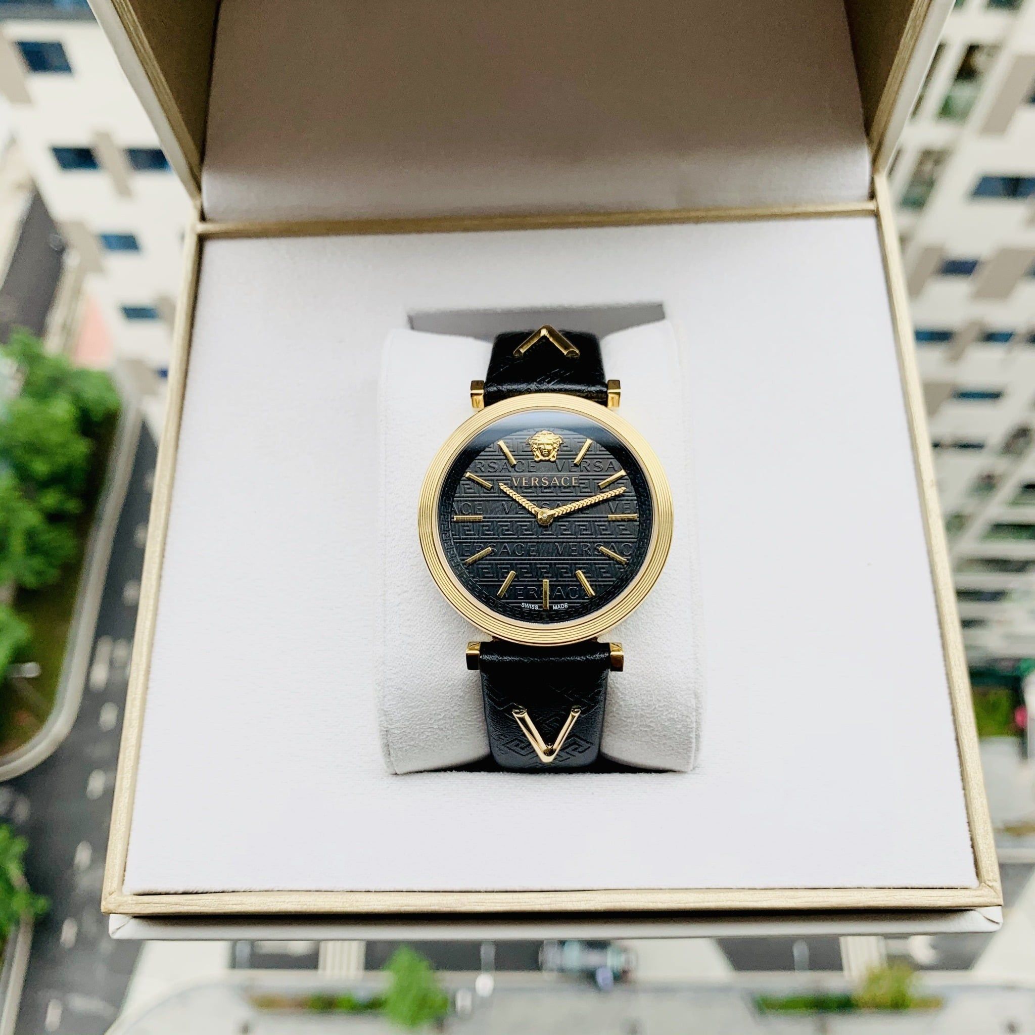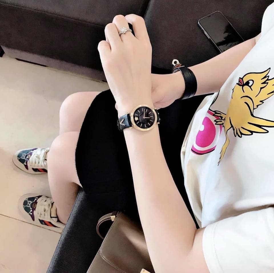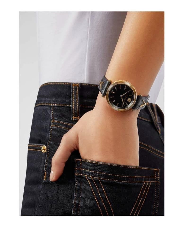 - Đáy khắc logo Medusa đẹp mắt, ở giữa là nút nhấn chỉnh giờ- Dây da đen với các vân nổi là các họa tiết Greca và được làm nổi bật với 2 chữ V nổi 3D màu Gold