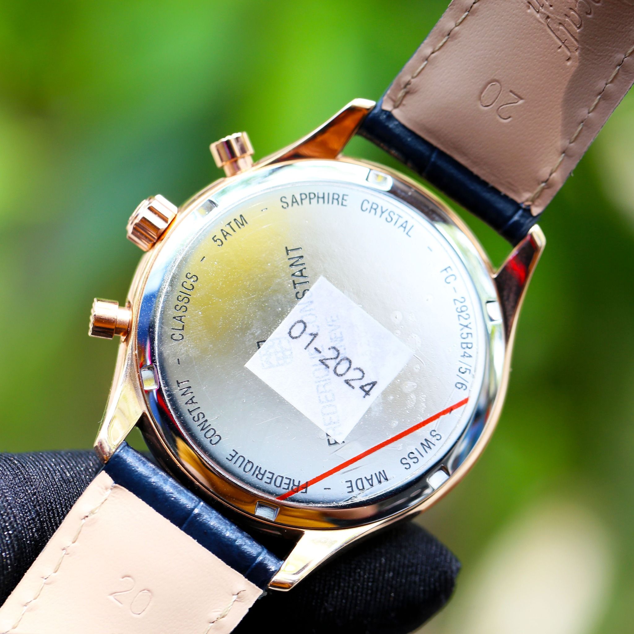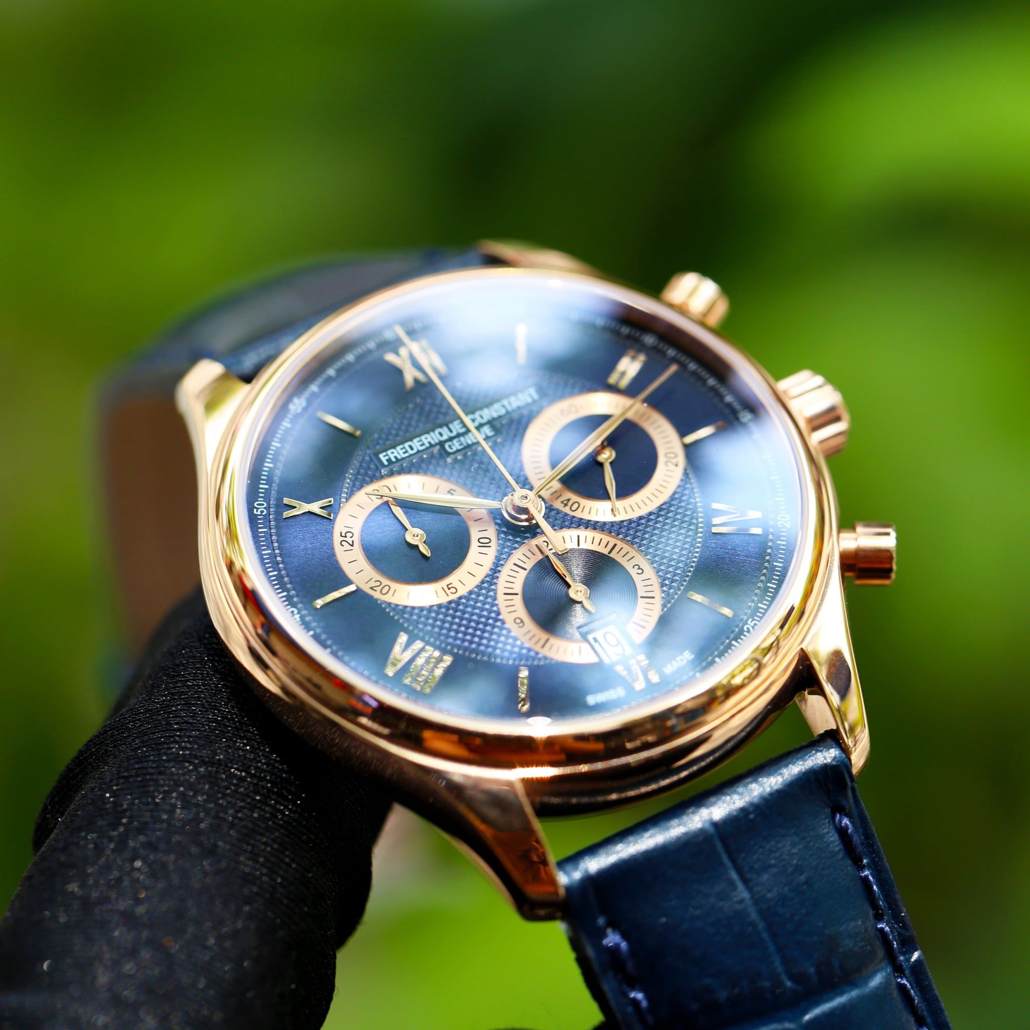 Được sử dụng bộ máy Quartz Calibre FC-292. Viền và vỏ của đồng hồ được làm bằng thép 316L không gỉ cao cấp mạ PVD vàng hồng sang trọng, thiết kế mặt xanh cực đẹp, viền trong đánh vân Guilloche lạ mắt, viền ngoài sử dụng viền trắng trơn đơn giản tạo sự khác biệt, cọc số vạch xen kẽ cùng cọc số la mã đẹp mắt, 3 chức năng của đồng hồ nằm trong 3 vòng tròn nhỏ riêng lẻ khác nhau.