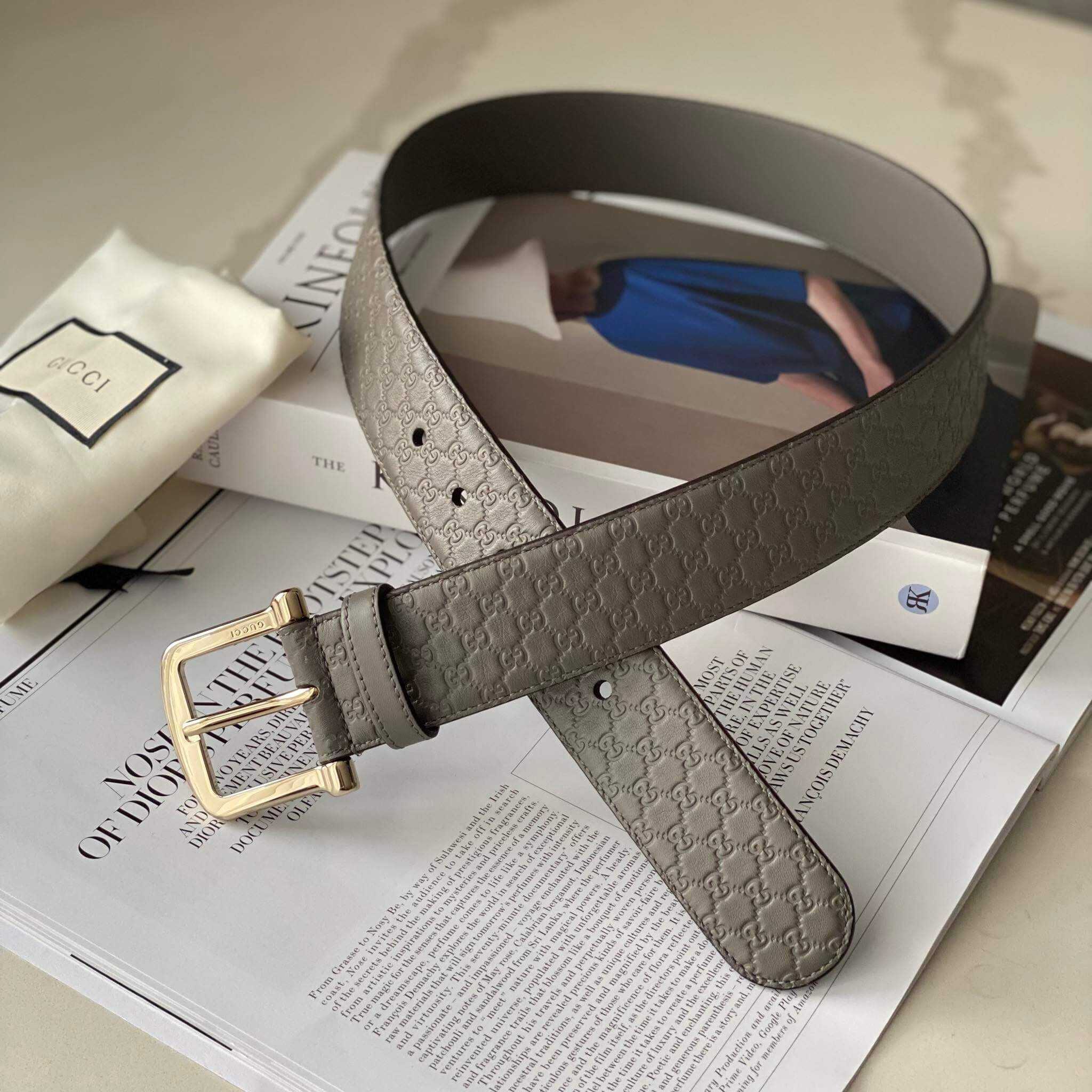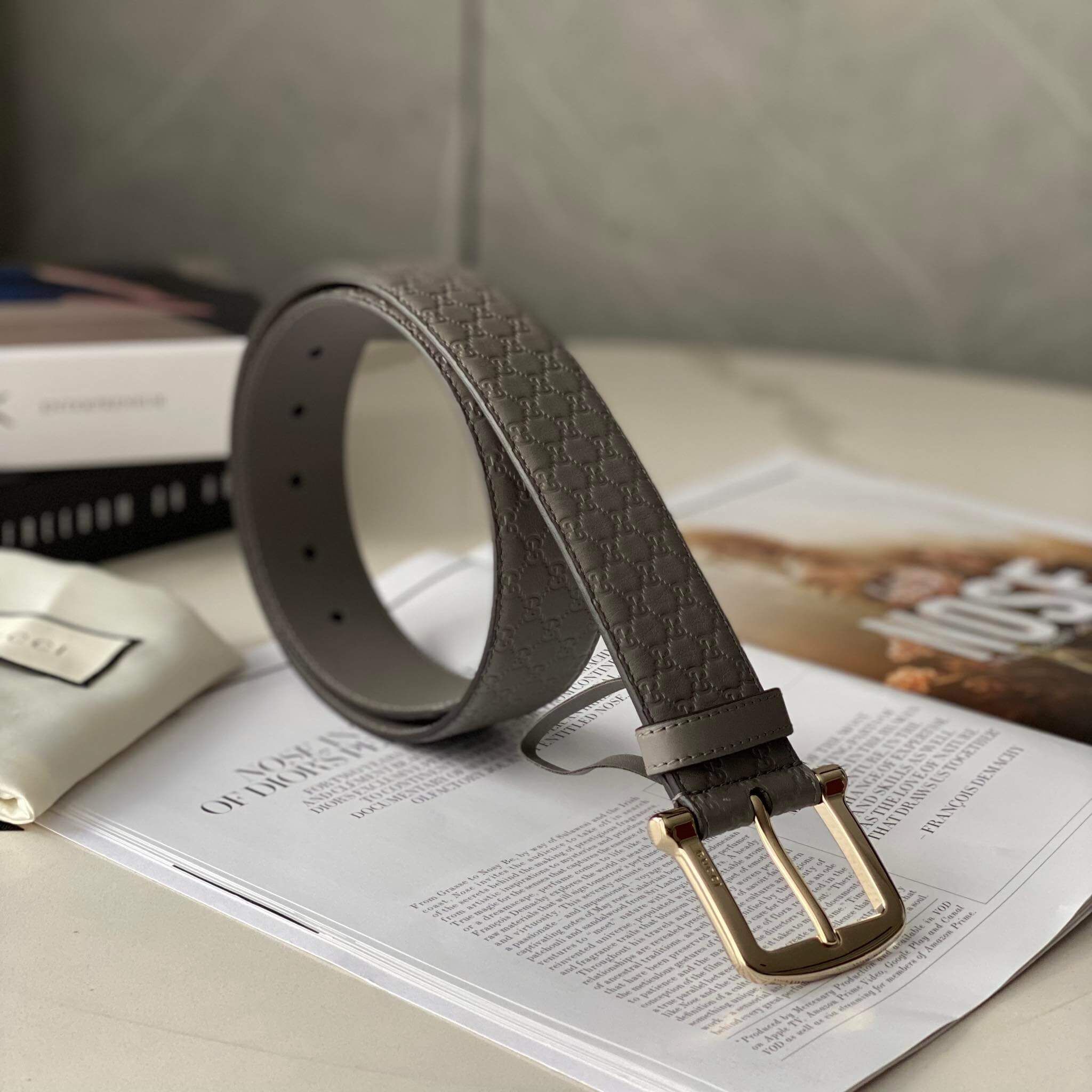 Một chiếc belt GC vân GG quá quen thuộc, nay mới có sale tốt các bác ơi. Màu xám grey rất sang, khóa gold nha