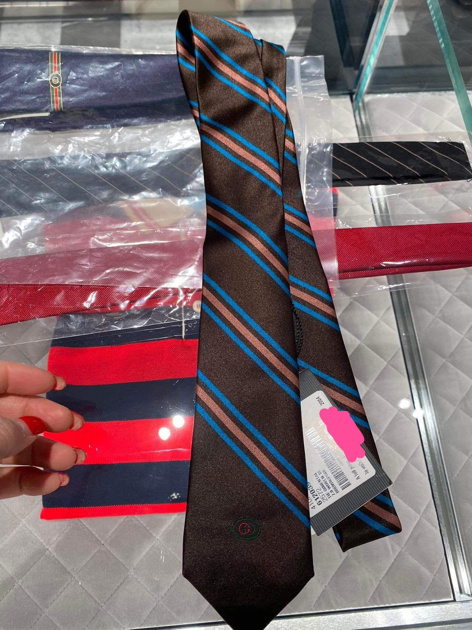 Một chiếc cà vạt từ Gucci với họa tiết sọc chéo thêu nổi chữ G nhỏ xinh – một sự phối hợp quá tinh tế.