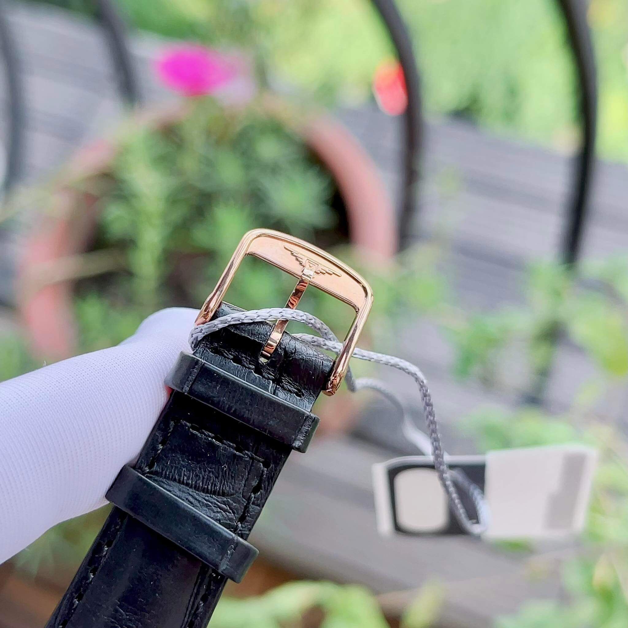 Toàn bộ thân đồng hồ làm bằng vàng đúc 18k, cọc số đính kim cương