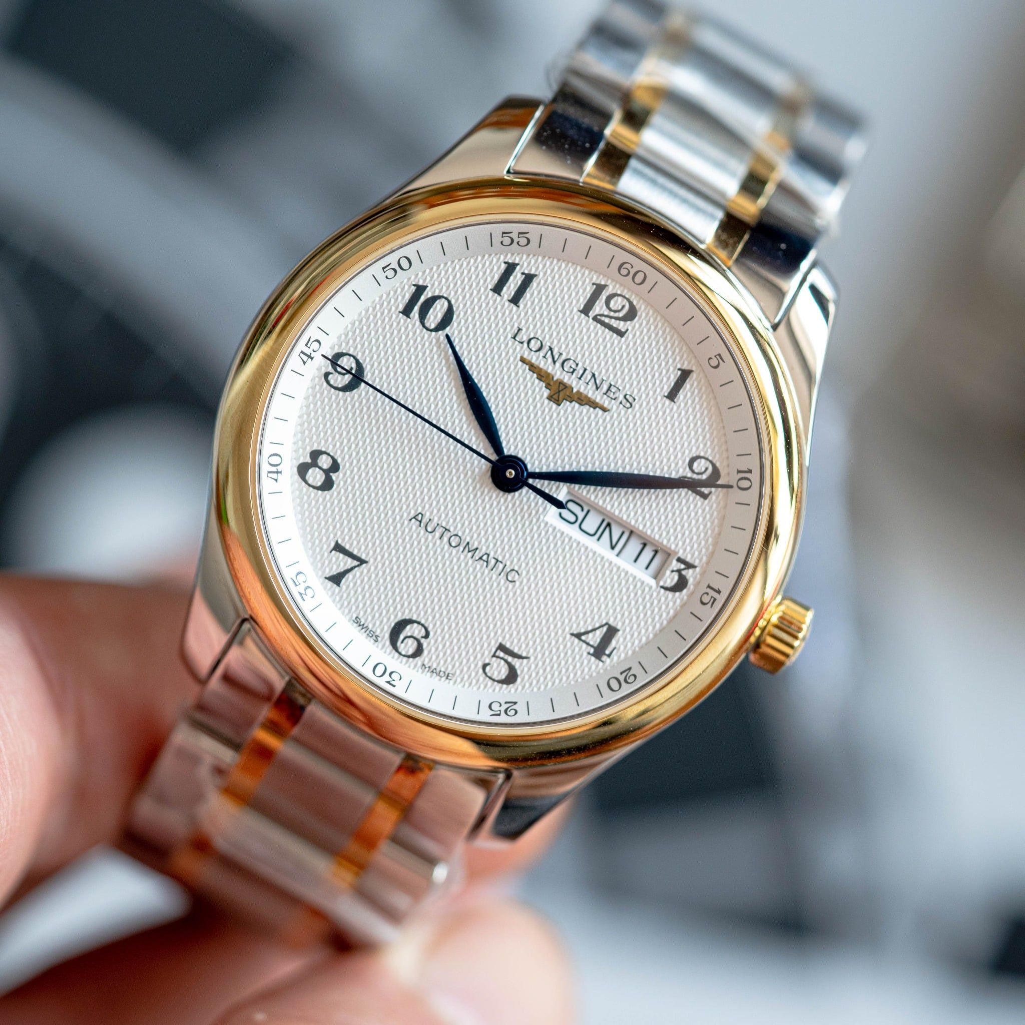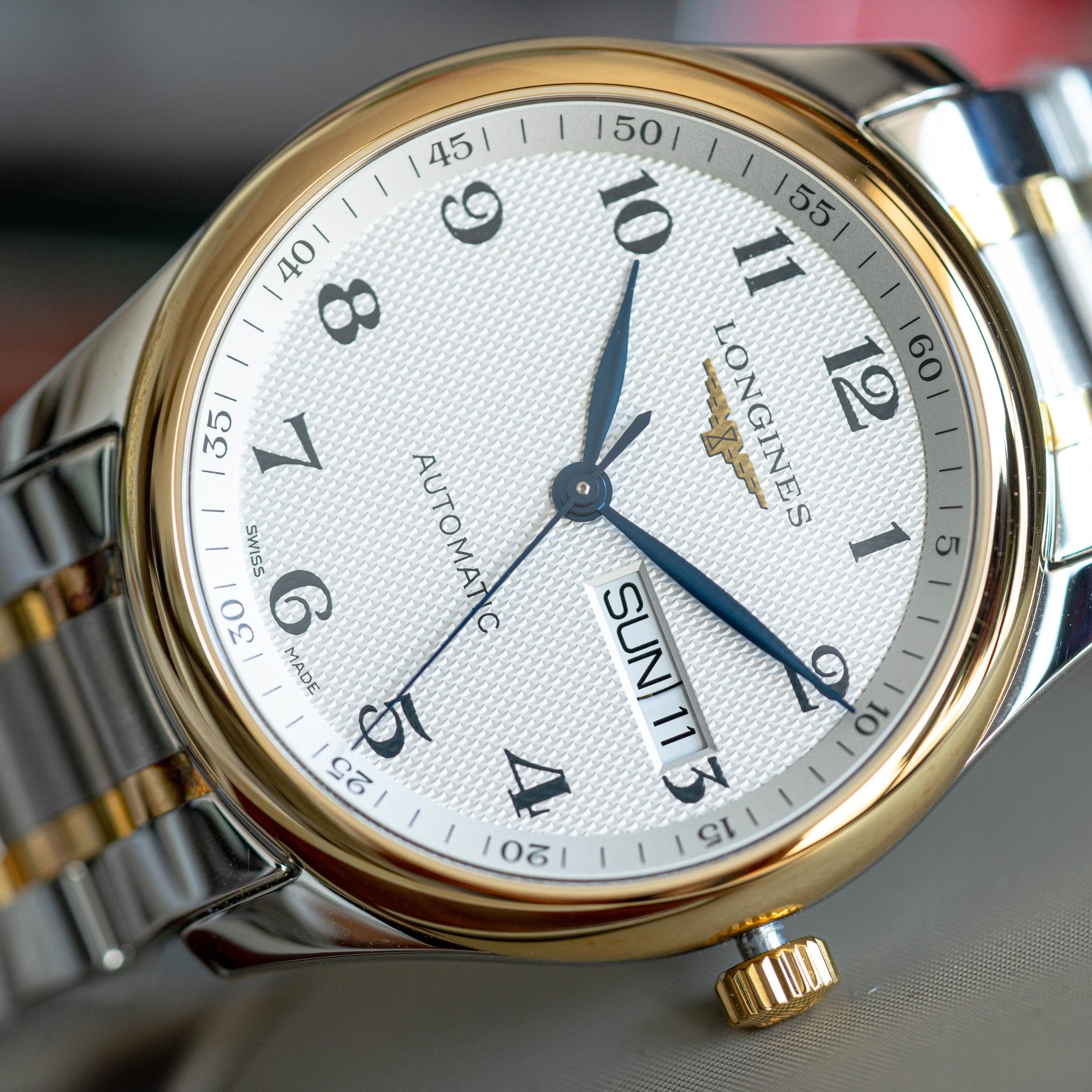 Bộ cọc số học trò cách điệu đặc trưng của Longines kết hợp cùng bộ kim lá liễu được nung xanh tạo nên 1 thiết kế cổ điển sang trọng rất ấn tượng