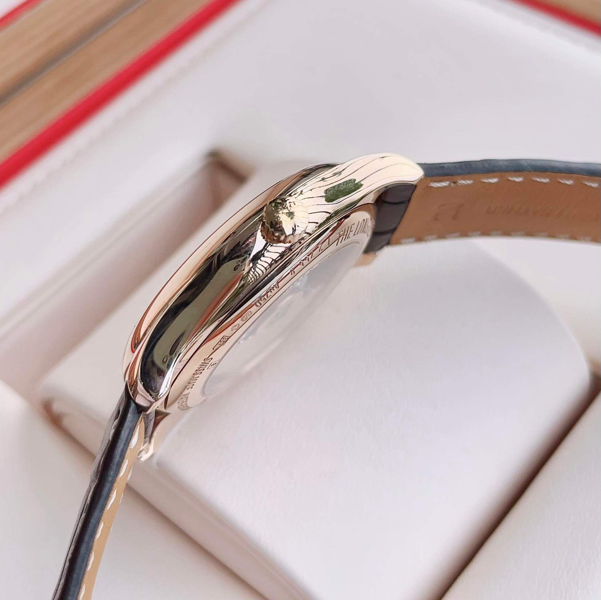 Toàn bộ phần vỏ được đúc bằng vàng solid gold 18k (triện chứng nhận ở đáy)