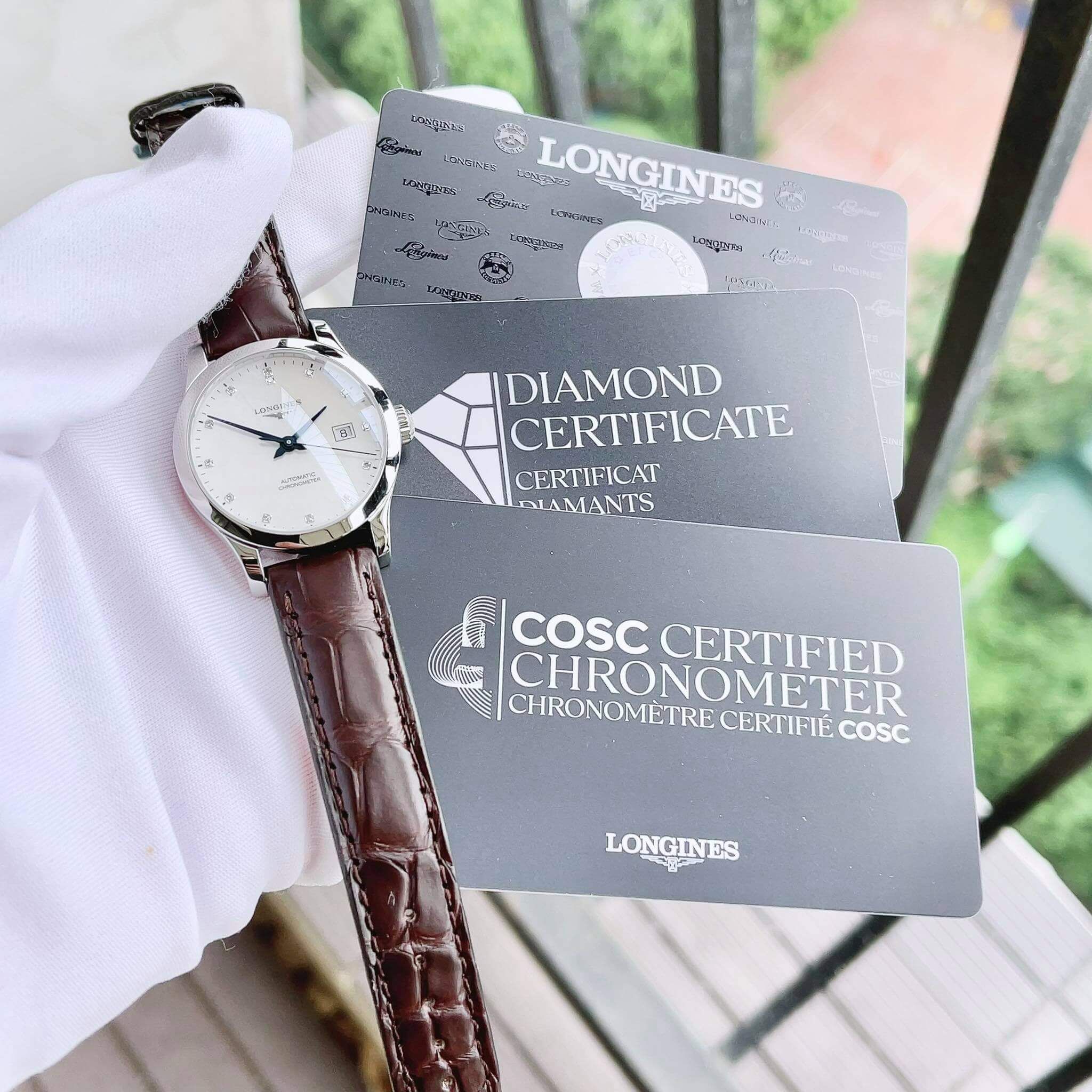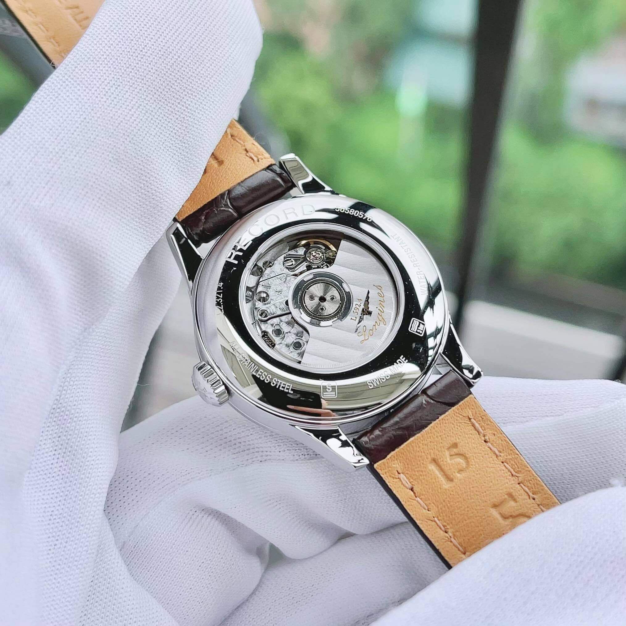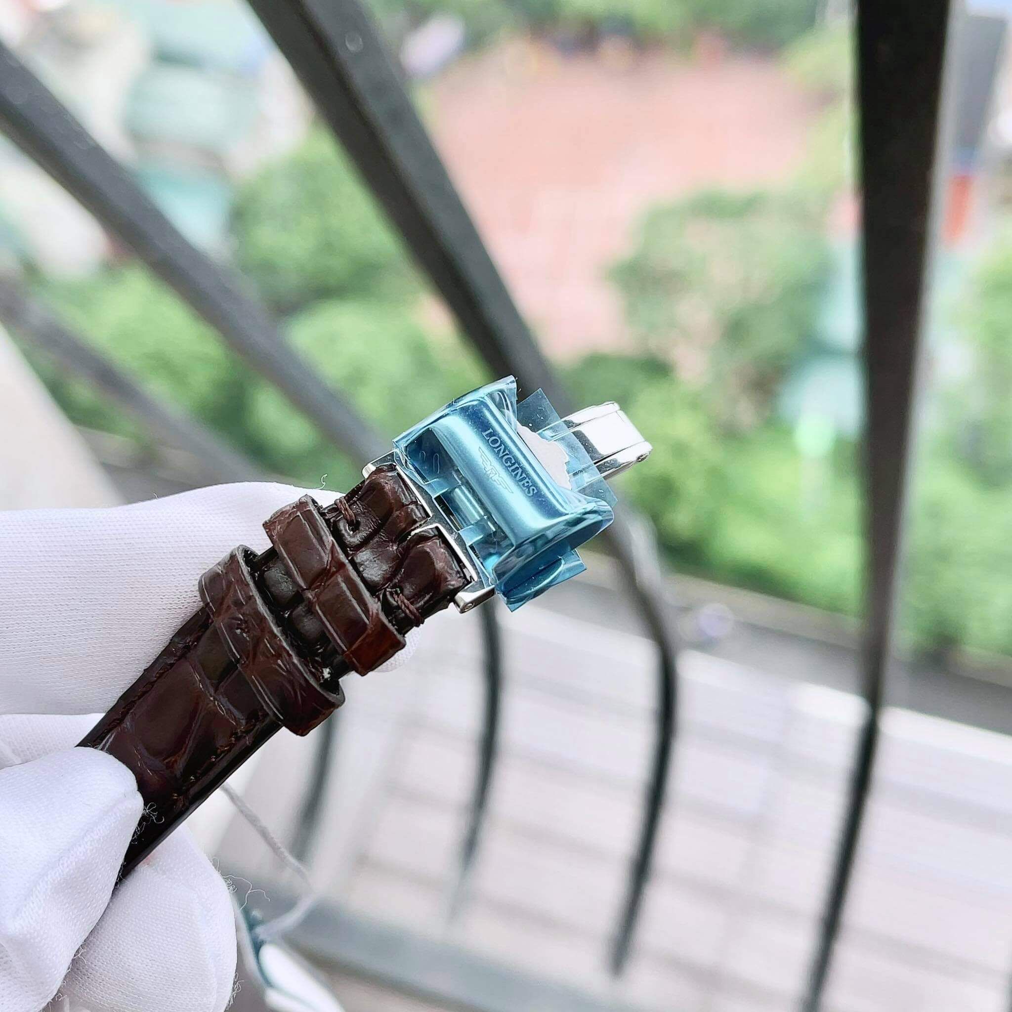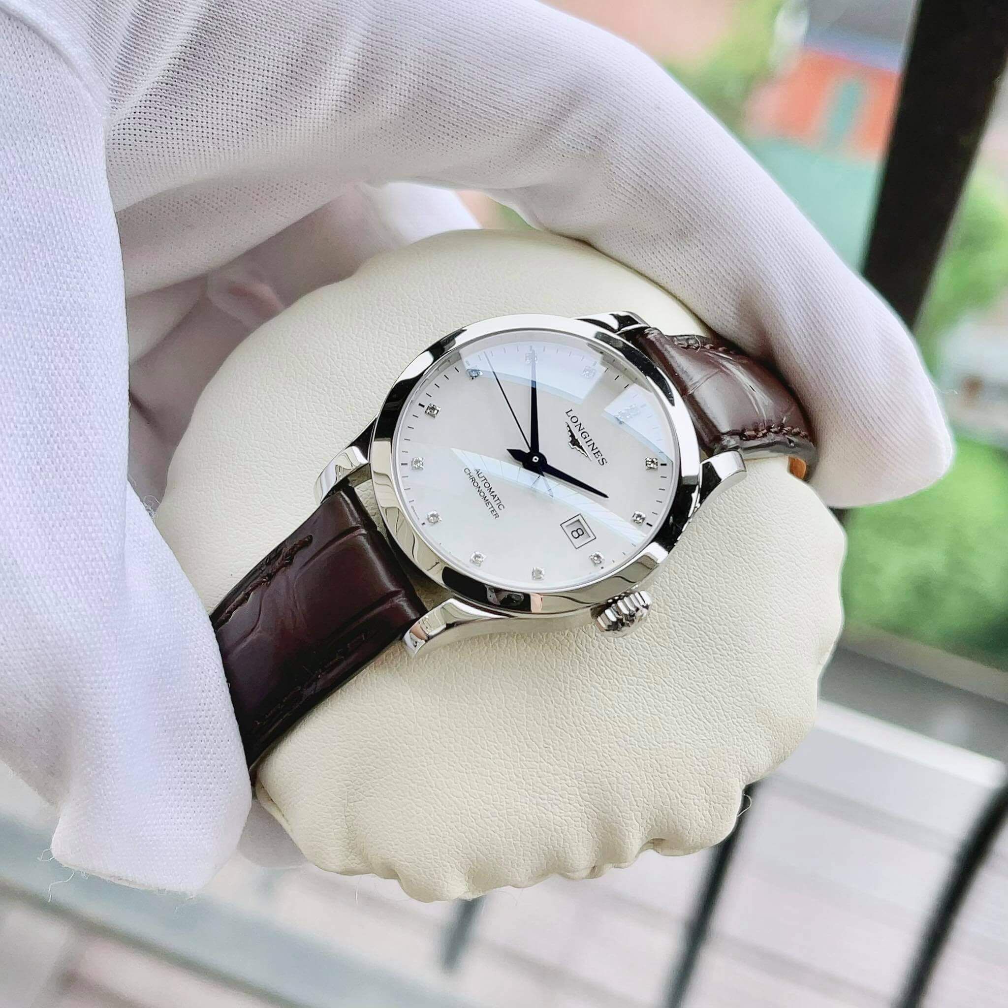 LONGlNES kim cương mặt khảm trai sang trọng tinh tế dành cho các nàngVỏ thép dây da nâu