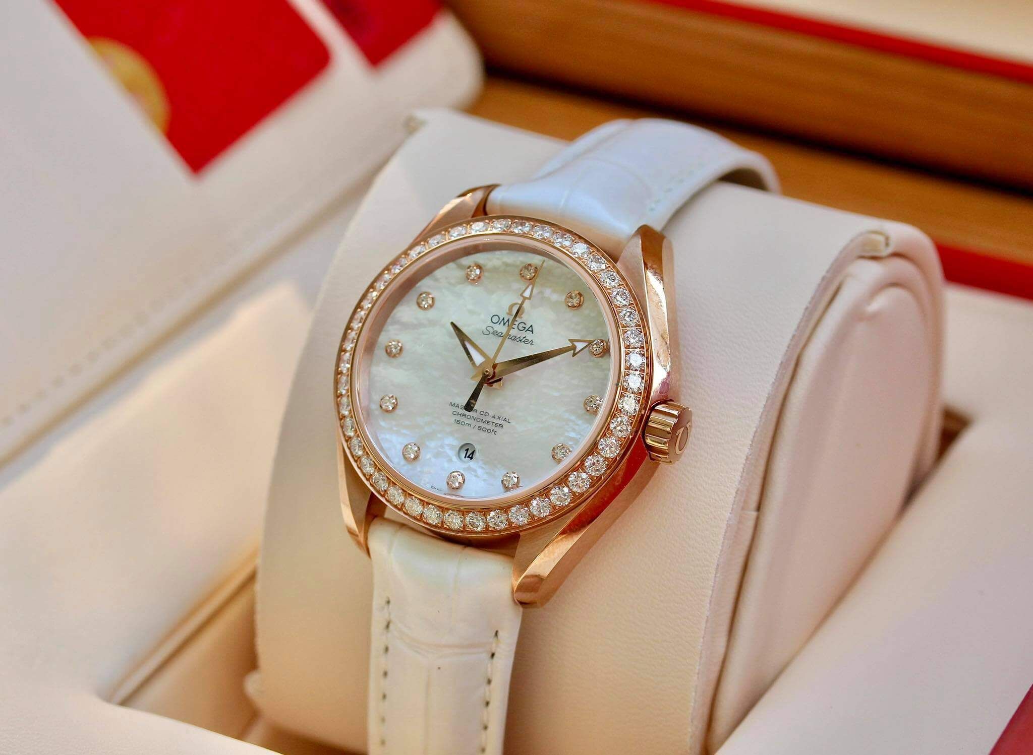 – Mặt ngọc trai tuyệt đẹp, cọc số đính Kim cương tròn, lịch ngày góc 6h cân đối