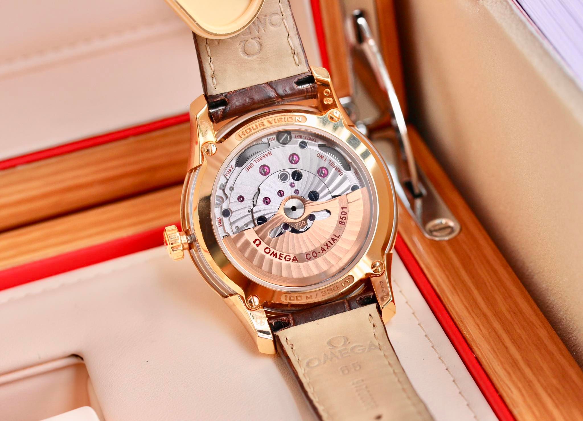 – Máy Omega Inhouse Caliber 8501 với cực nhiều tính năng & cải tiến : Củ văng rotor & bridge vàng khối Au750 18k. Chuẩn COSC chính xác, Co-Axial escapement, 2 ổ cót, Sillicon Balance Si14, chống từ rất tốt. 39 chân kính, 60h tích cót & 25200 vph