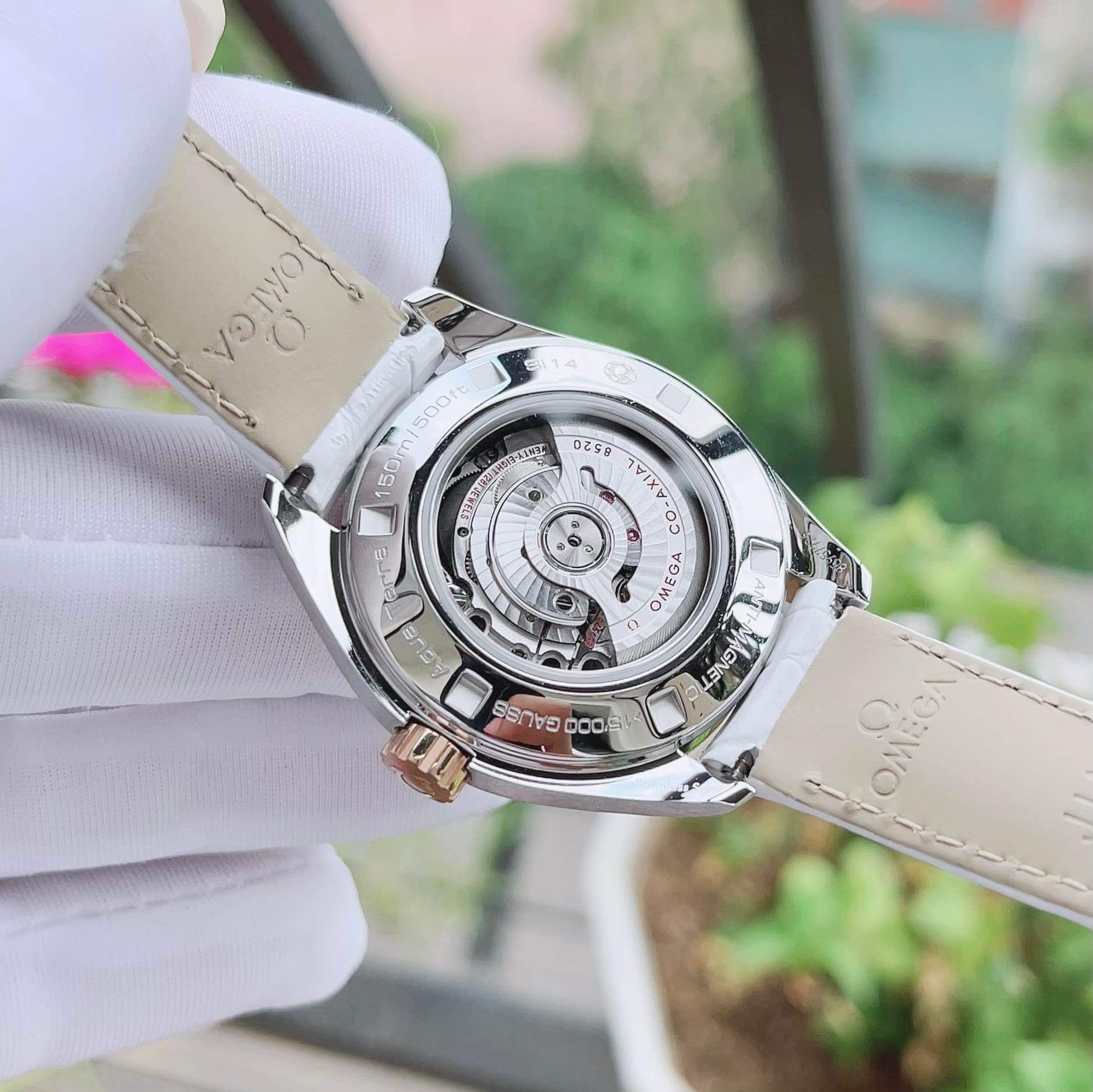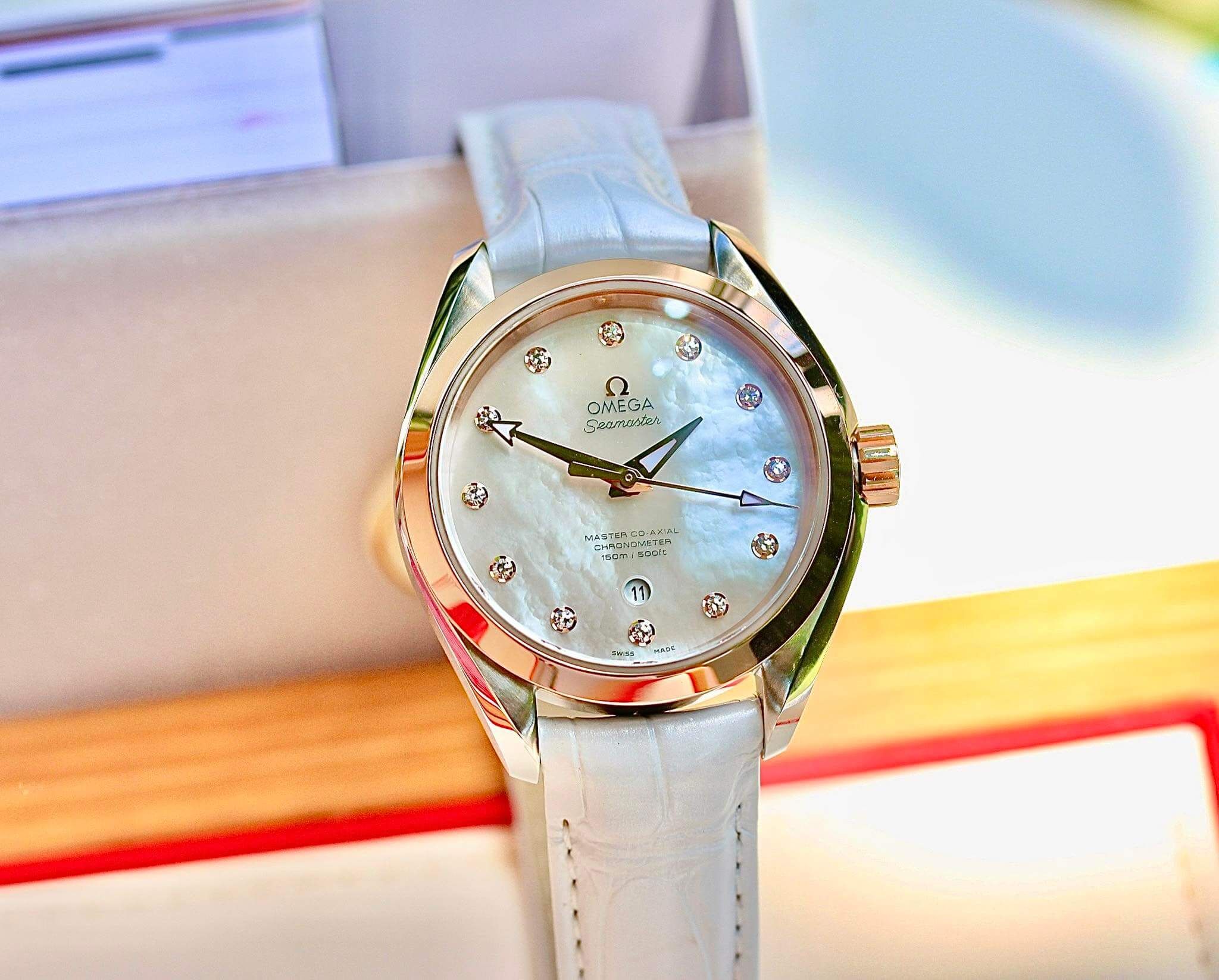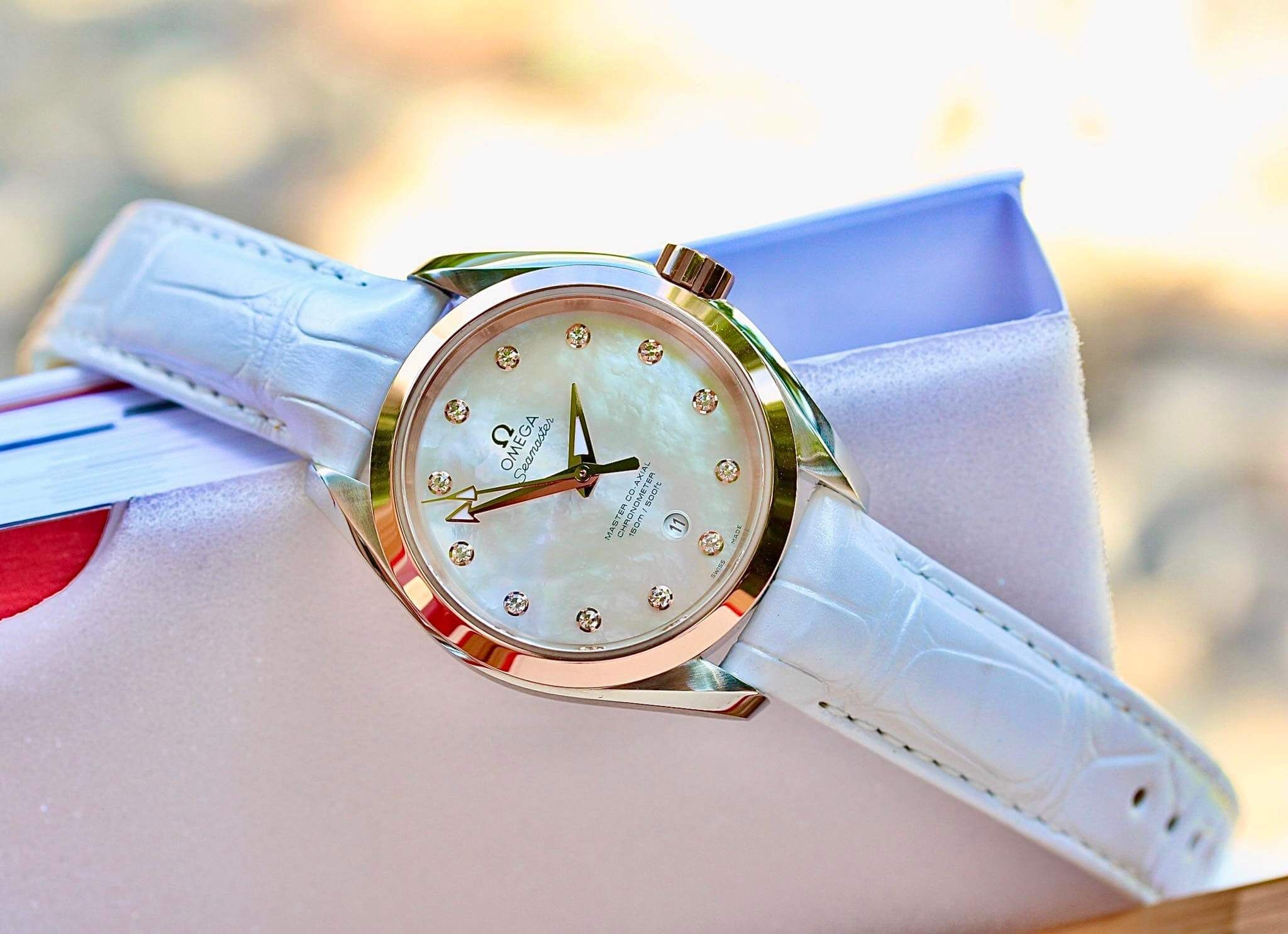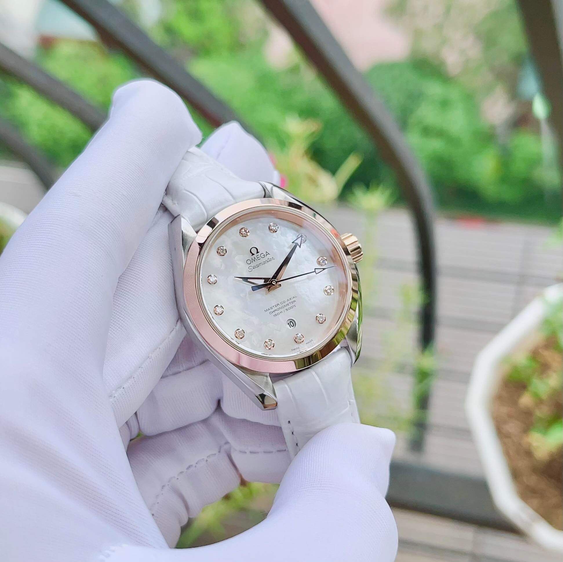Omega cọc số đính kim cương, niềng vàng hồng 18k, mặt khảm trai rồi ạ