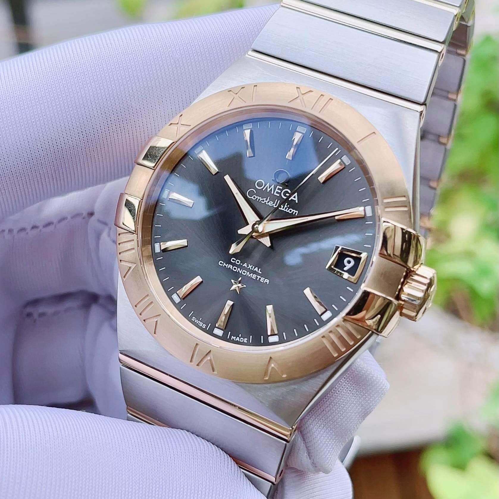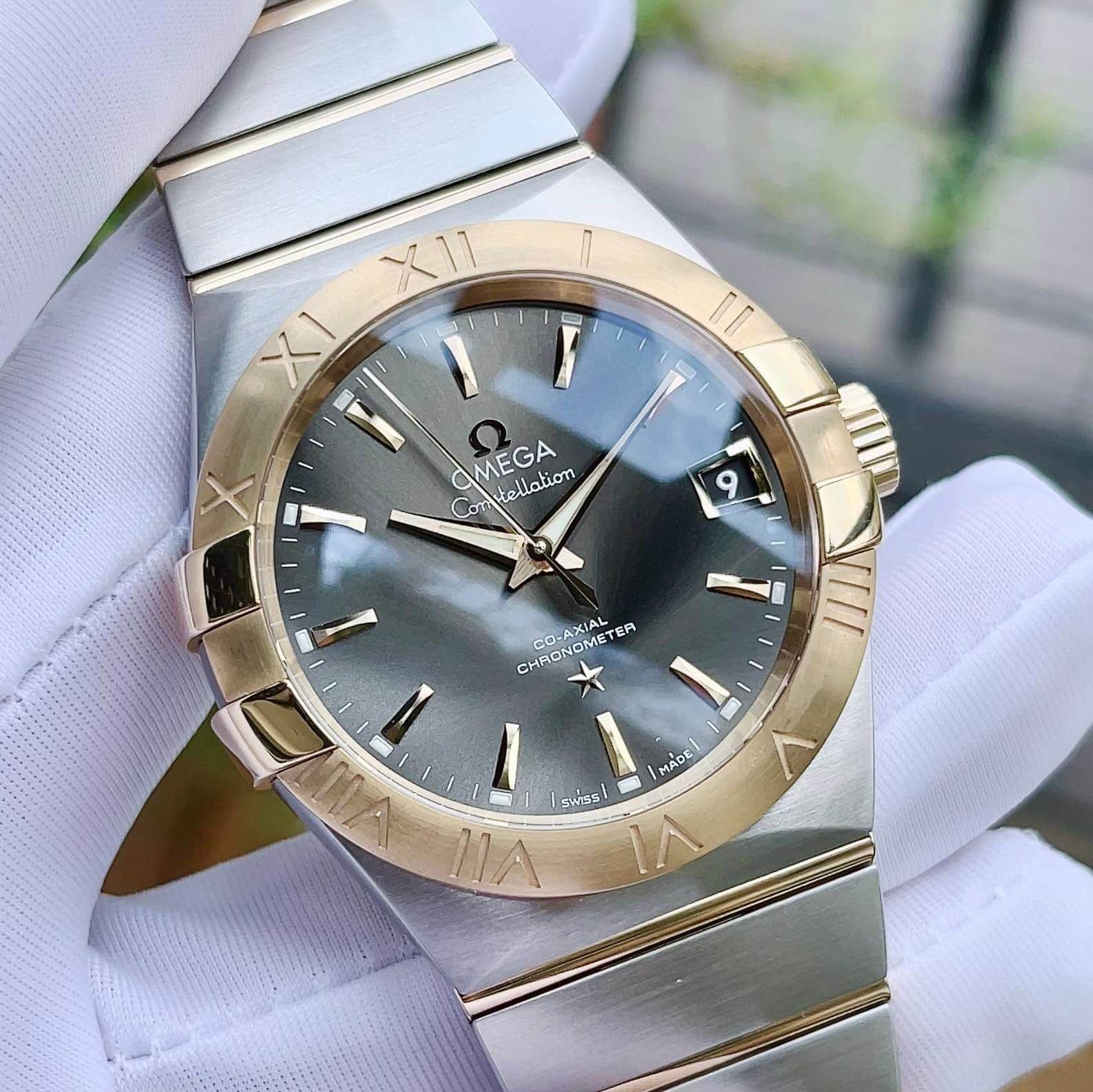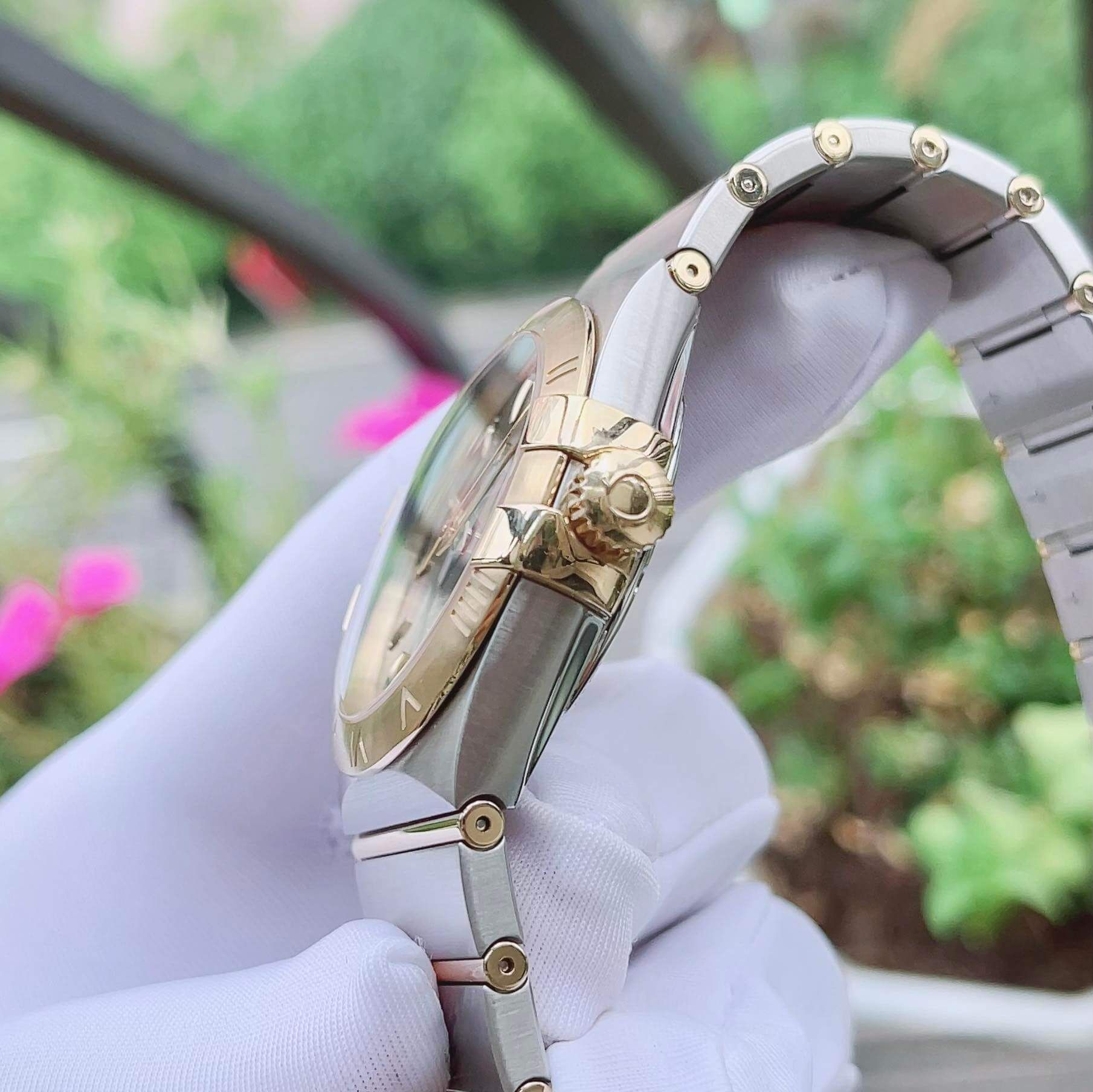 Size 38, mức độ chịu nước 10bar, thiết kế conste kinh điển, mặt vân, vành gold 18k