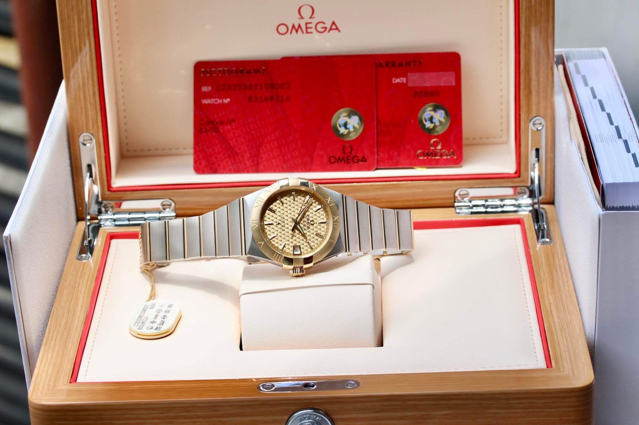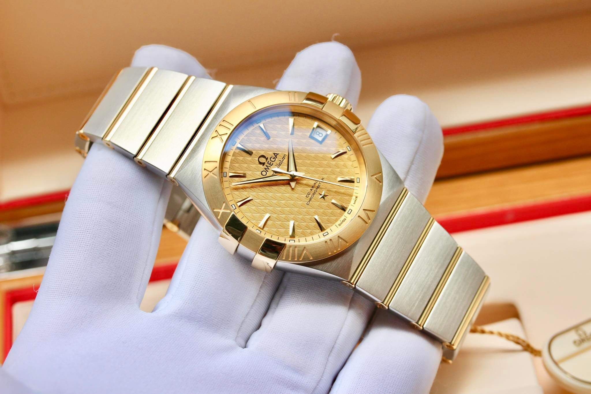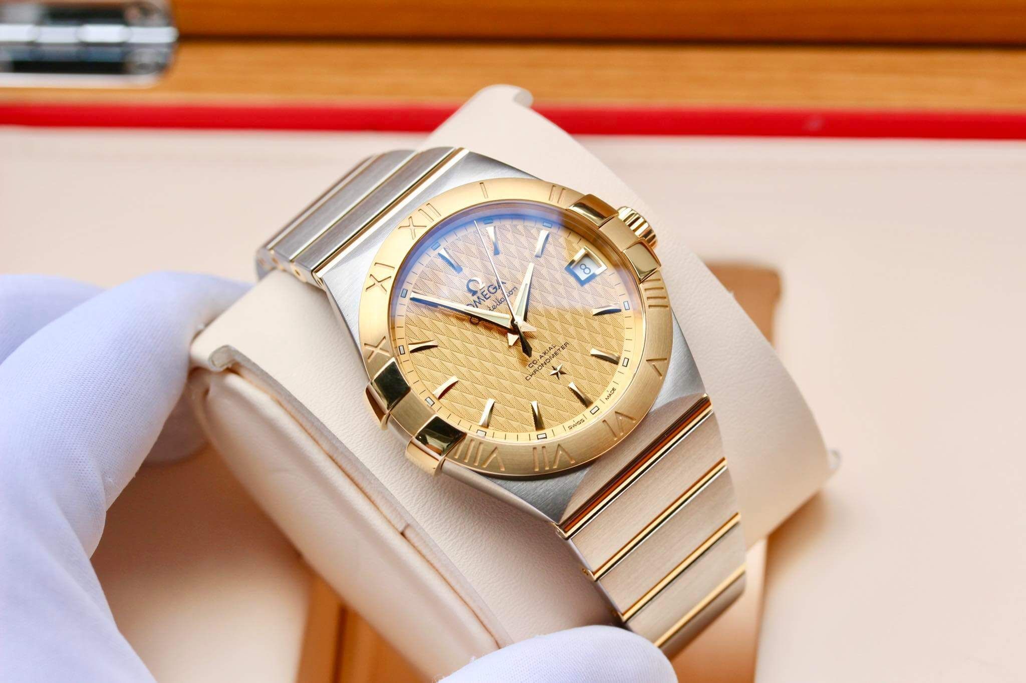 In Stock OMEGA ConstellationSize 38, mức độ chịu nước 10bar, thiết kế conste kinh điển, mặt vân, vành gold 18k