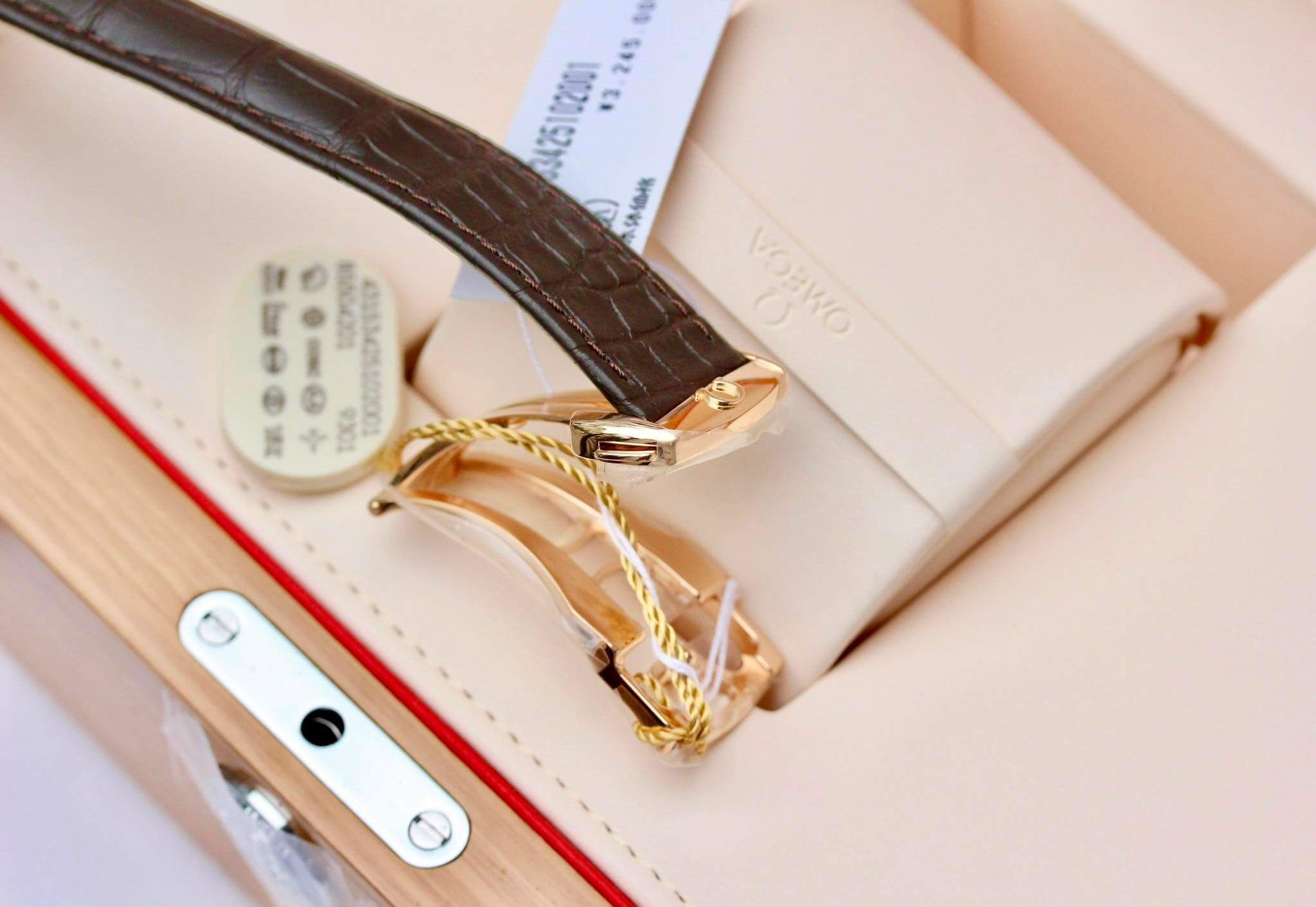 Toàn bộ vỏ, khoá đồng hồ được làm bằng vàng đúc rose gold 18k