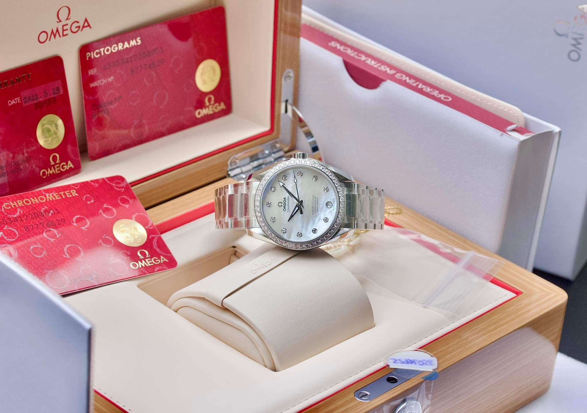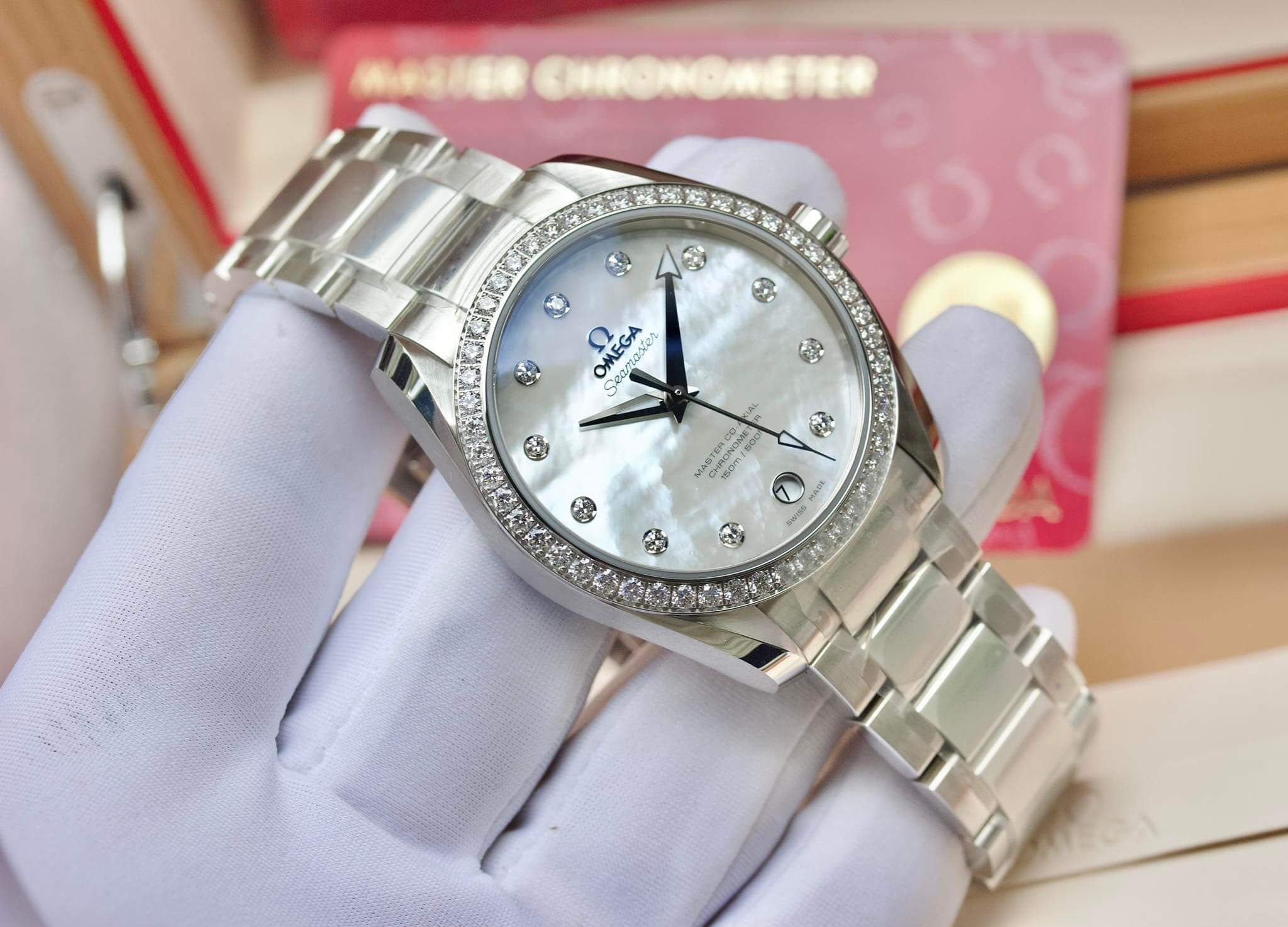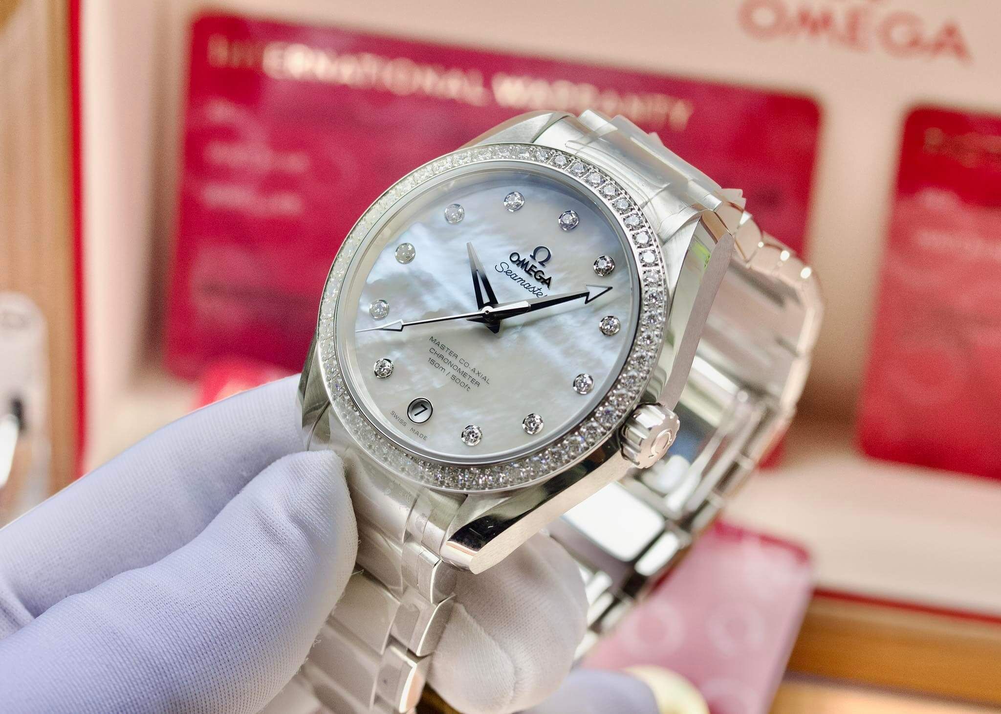 Omega Seamaster Aqua Terra Mother Of Pearl Diamond Benzel 231.15.39.21.55.001 với hình dáng Classic nhưng không hề đơn điệu với điểm nhấn Vành Kim + Mặt khảm trai MOP tuyệt đẹpThông tin chi tiết: