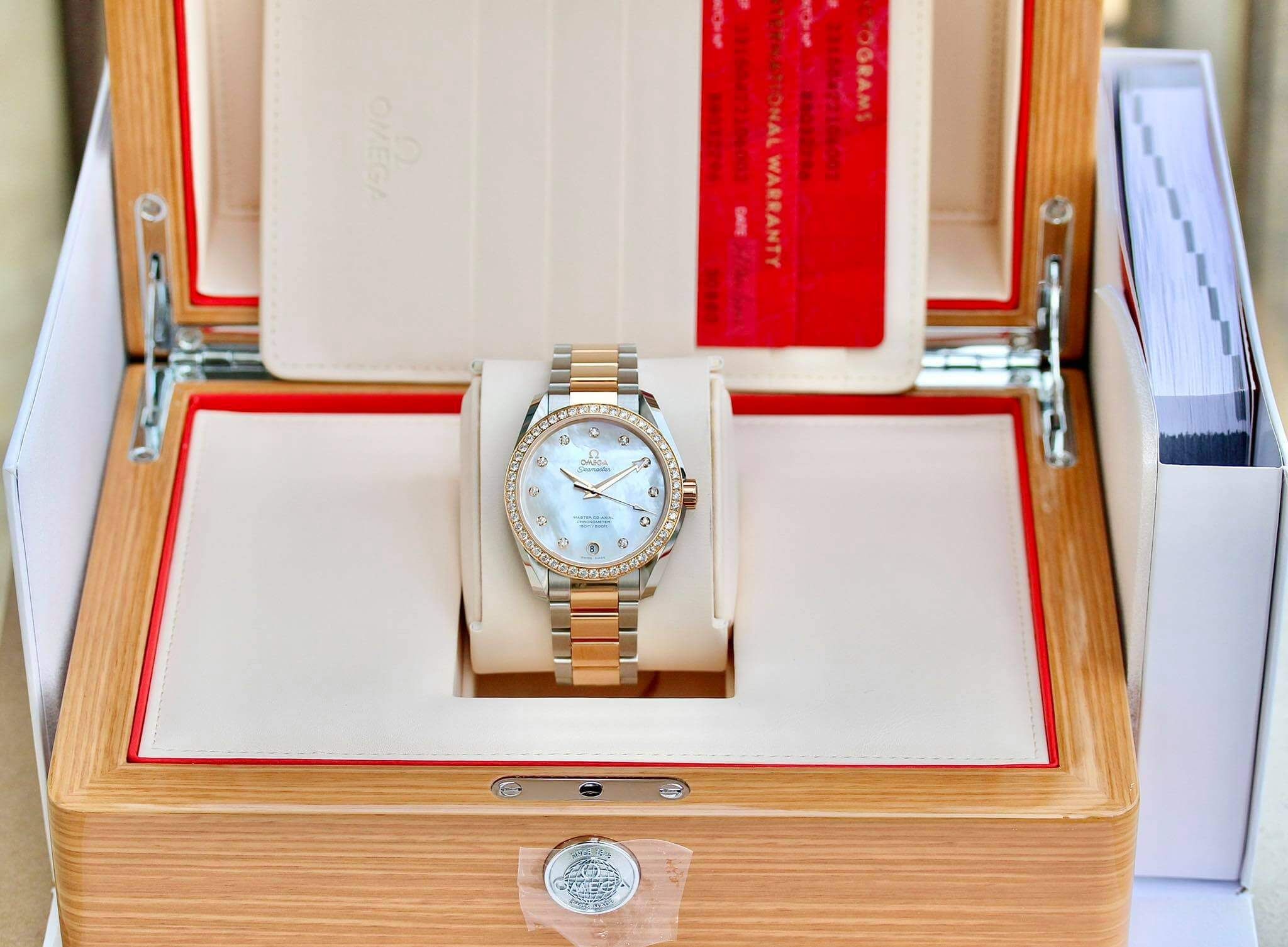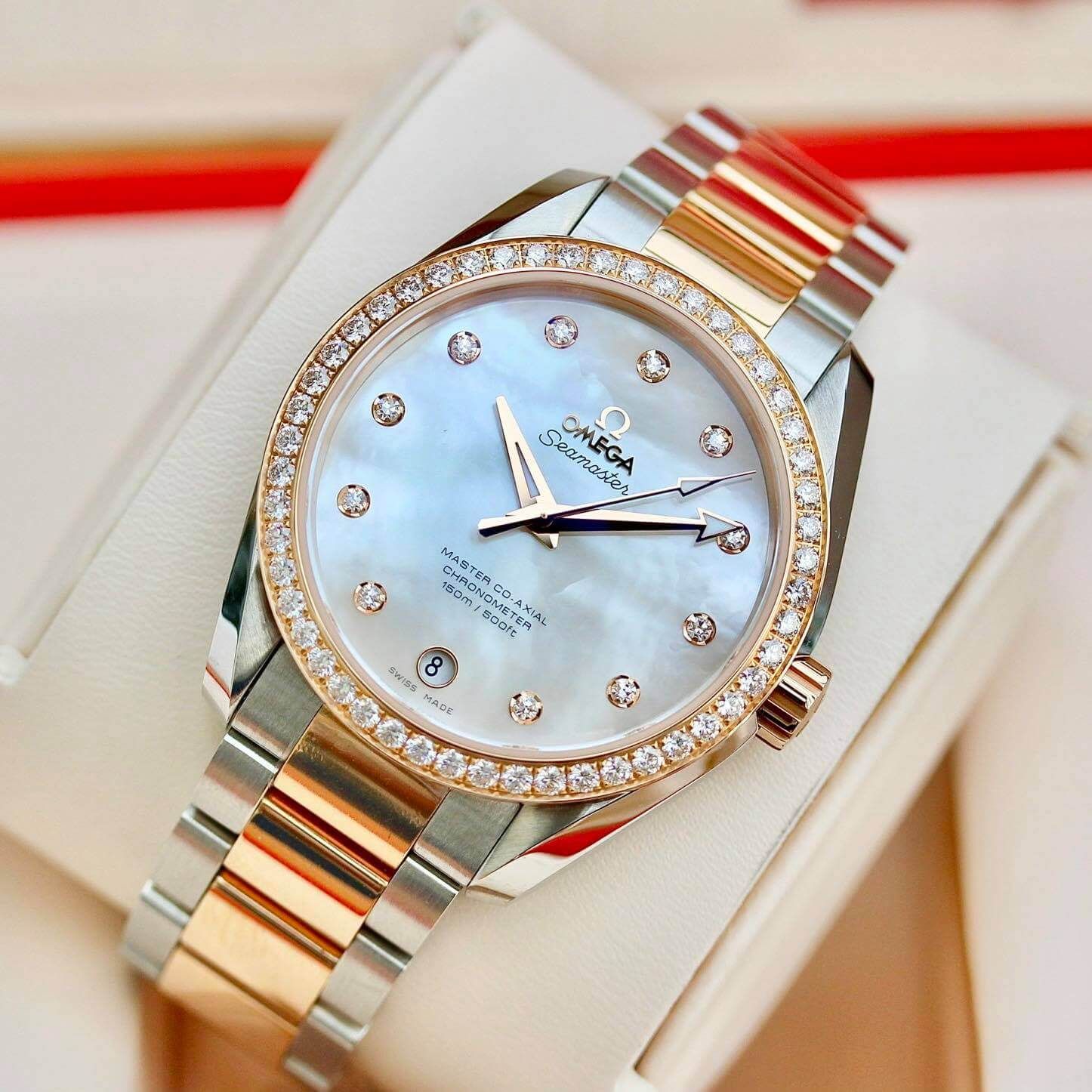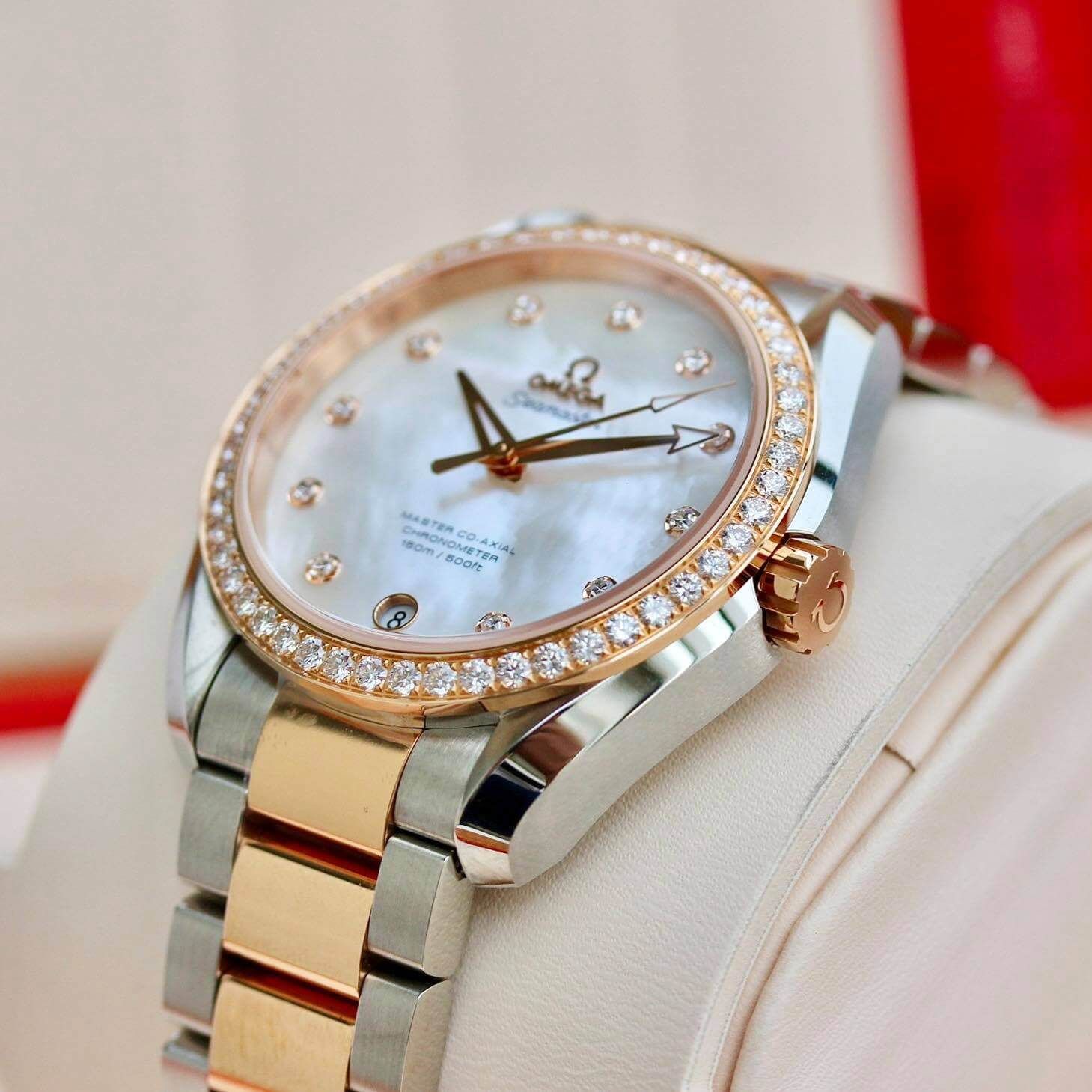 Tuyệt phẩm Seamaster thiết kế unisex độc đáo với bộ niềng full 42 viên Kim cương tự nhiên và 11 viên kim cương cọc số.Omega Seamaster AquaTerra Diamond Benzel, 38.5mm