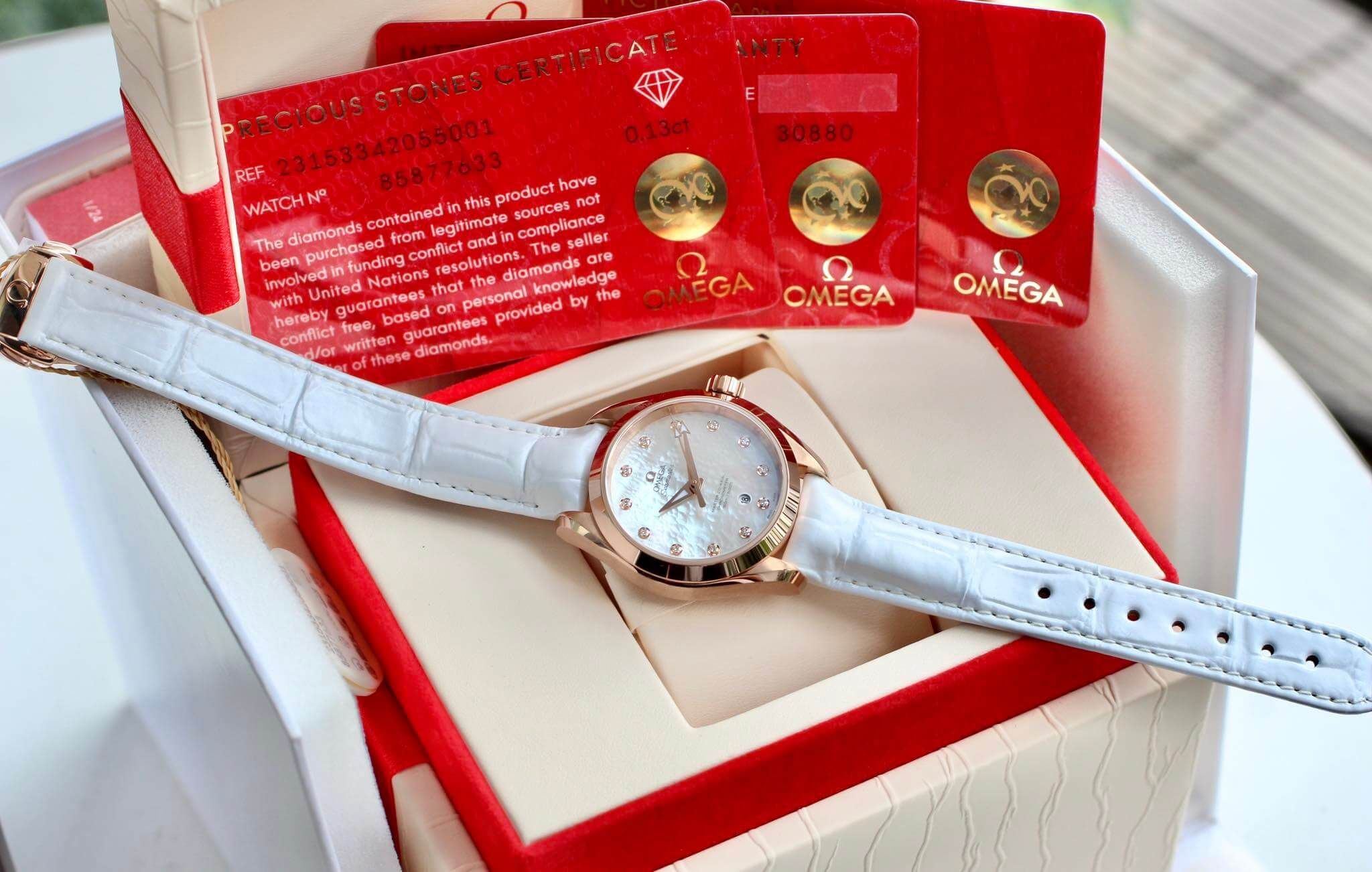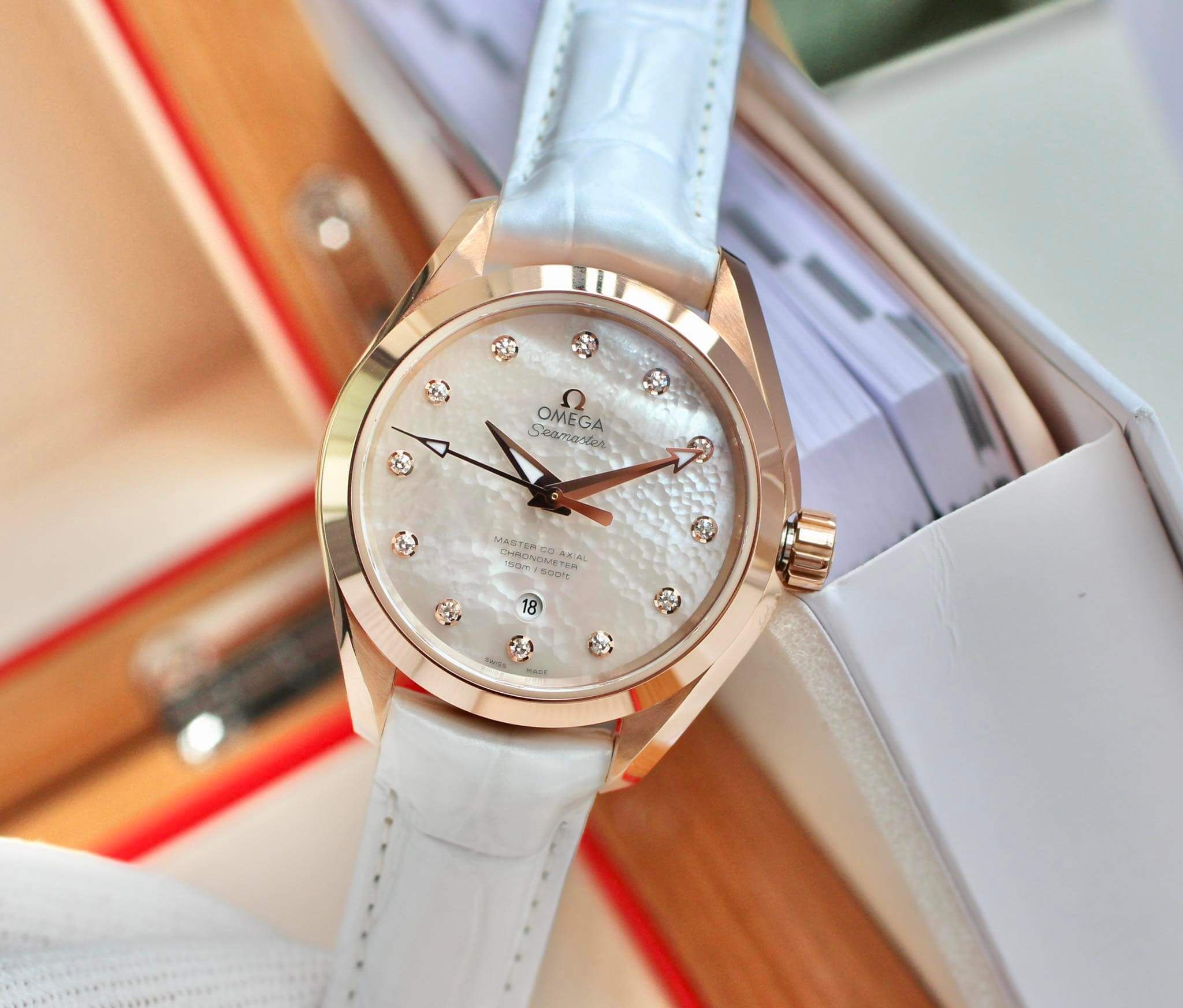 Omega Seamaster Aqua Terra 150M Master Co-Axial Chronometer với Dial ngọc trai cực quyến rũ và cọc số là 12 viên kim cươngBrand new fullbox seal, bảo hành toàn cầu 05 năm