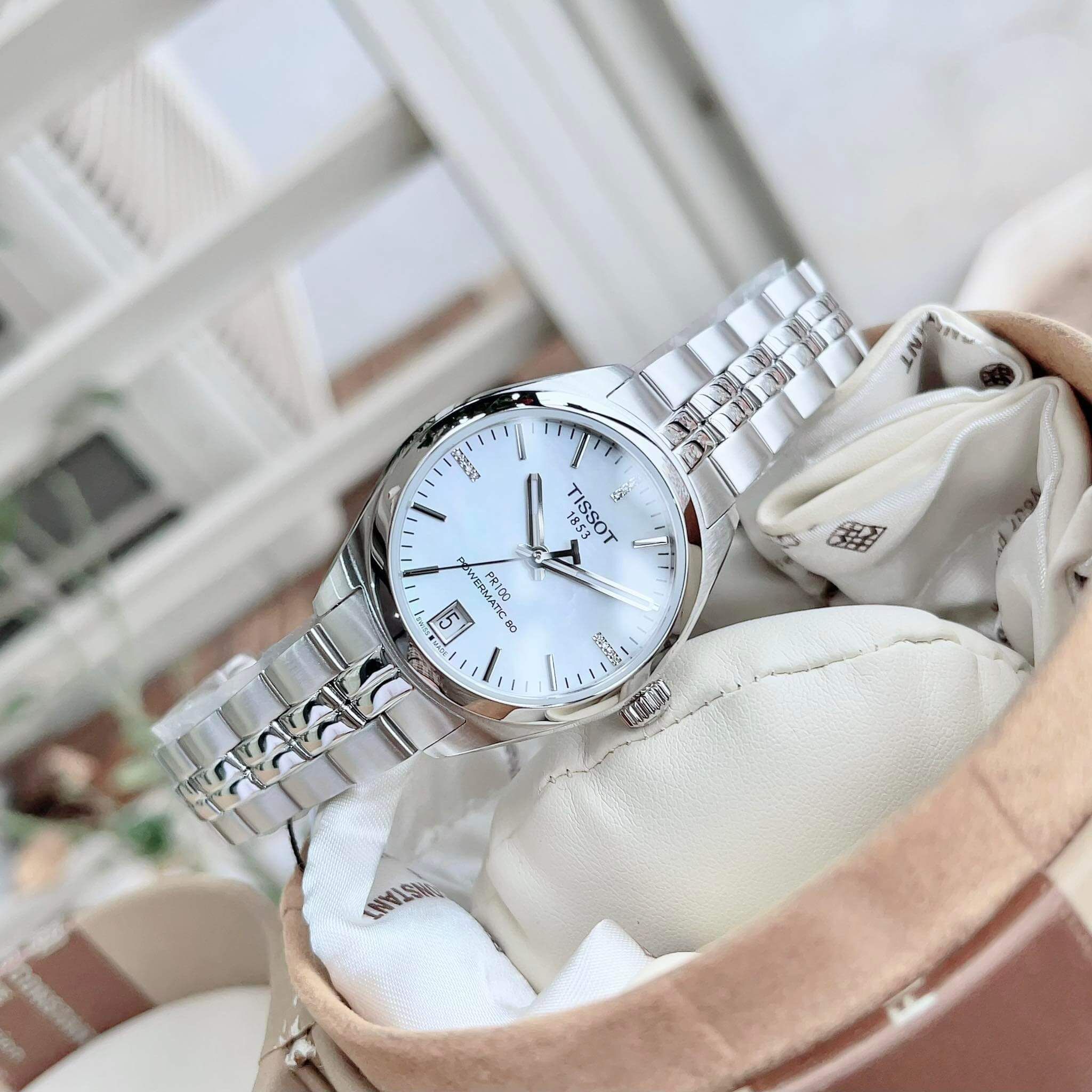 Tissot trắng tinh khôi – điểm nhấn mặt khảm trai MOP và cọc số đính kim cương