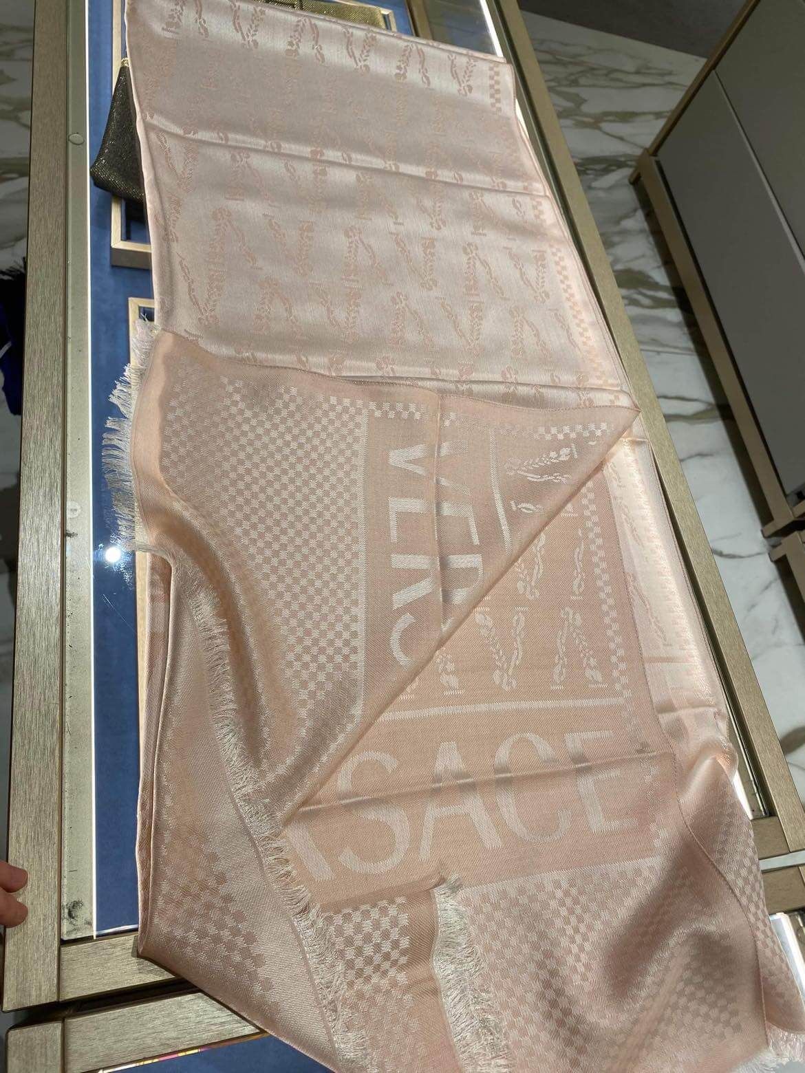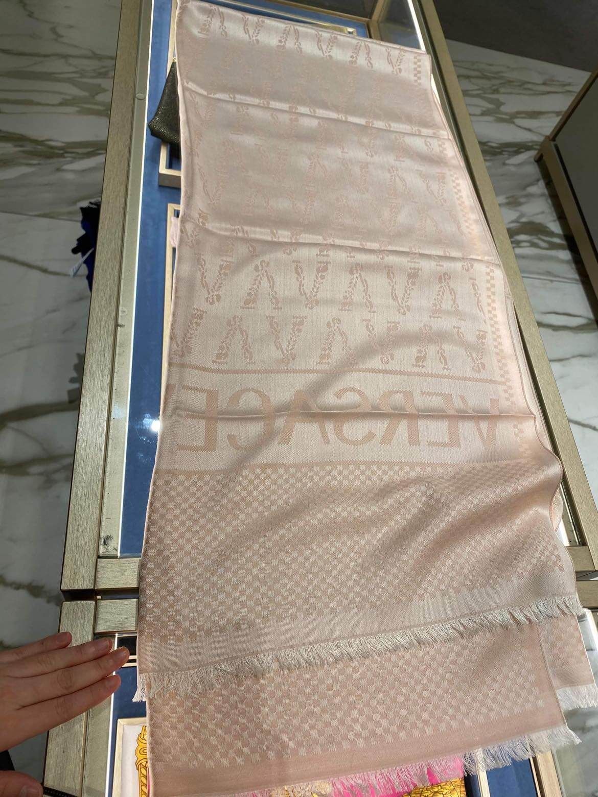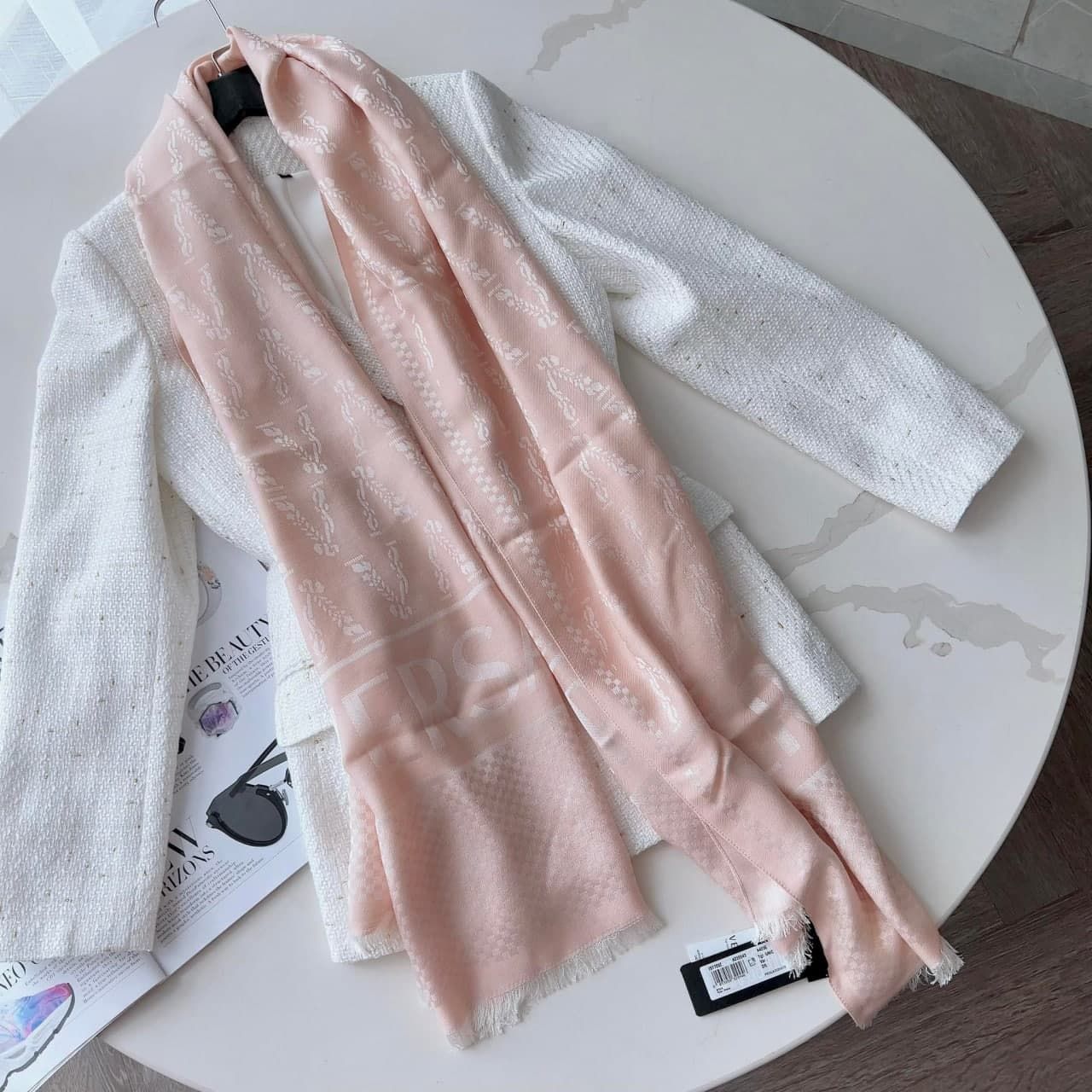 Đẹp xinh thực sự – VS made in italy với thiết kế chữ V đặc trưng của hãng, cùng chữ chạy ngang khăn siêu sang